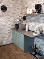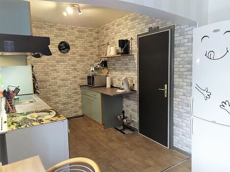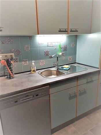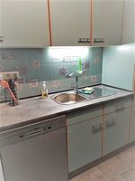 Cerankochfeld, Dunstabzugshaube, Kühlschrank mit Gefrierfach, Senseo-Kaffeeautomat, Eierkocher, Mixer, Korkenzieher / Flaschenöffner, Gewürze (Salz, Pfeffer, Zucker), Öl / Essig, Geschirrhandtücher, Mülltüten, Essplatz in der Küche