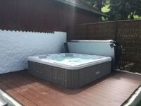 Ferienhaus Kuferhaus, Whirlpool mit Seeblick im Garten, Zaun, WLAN