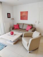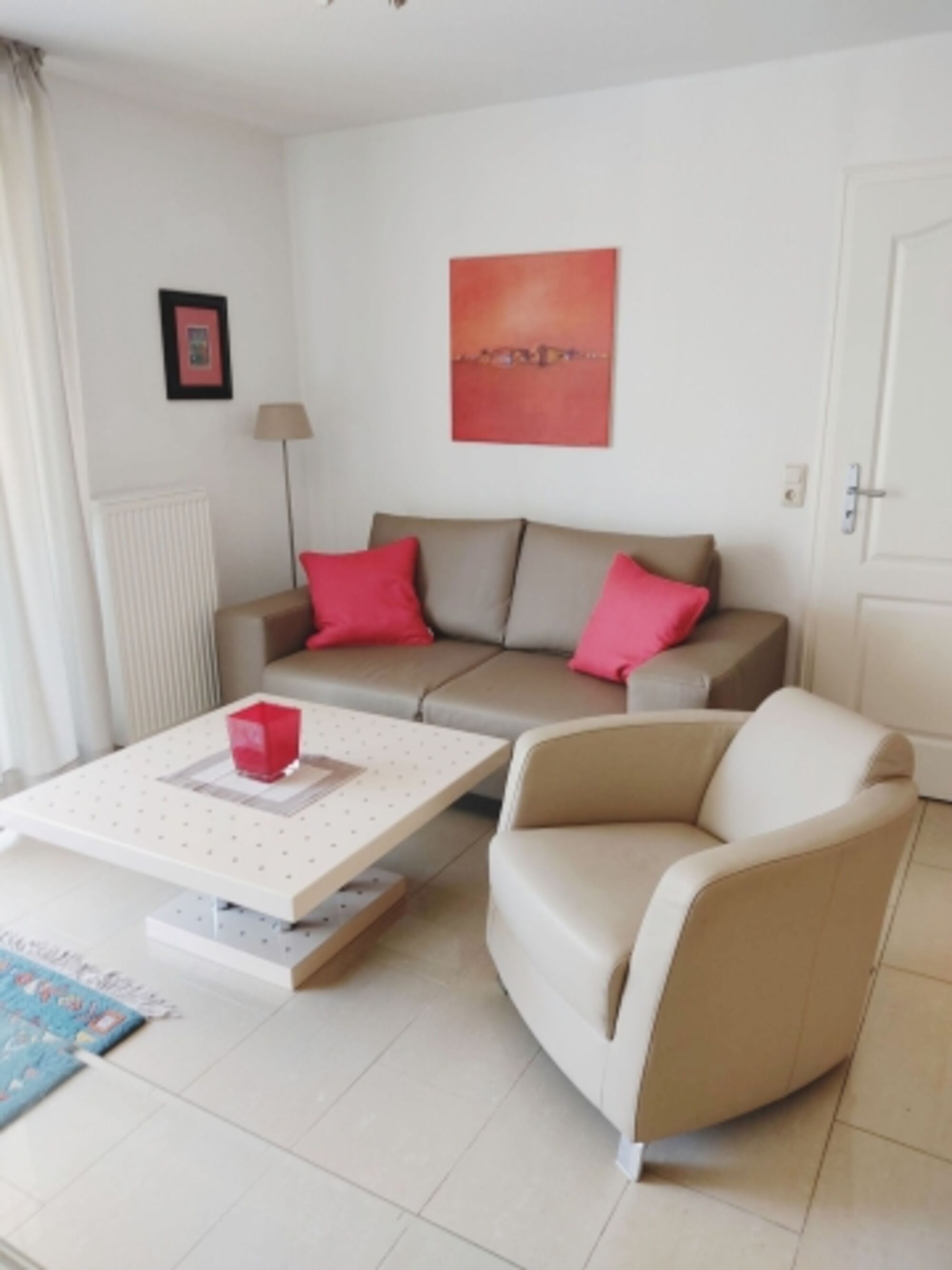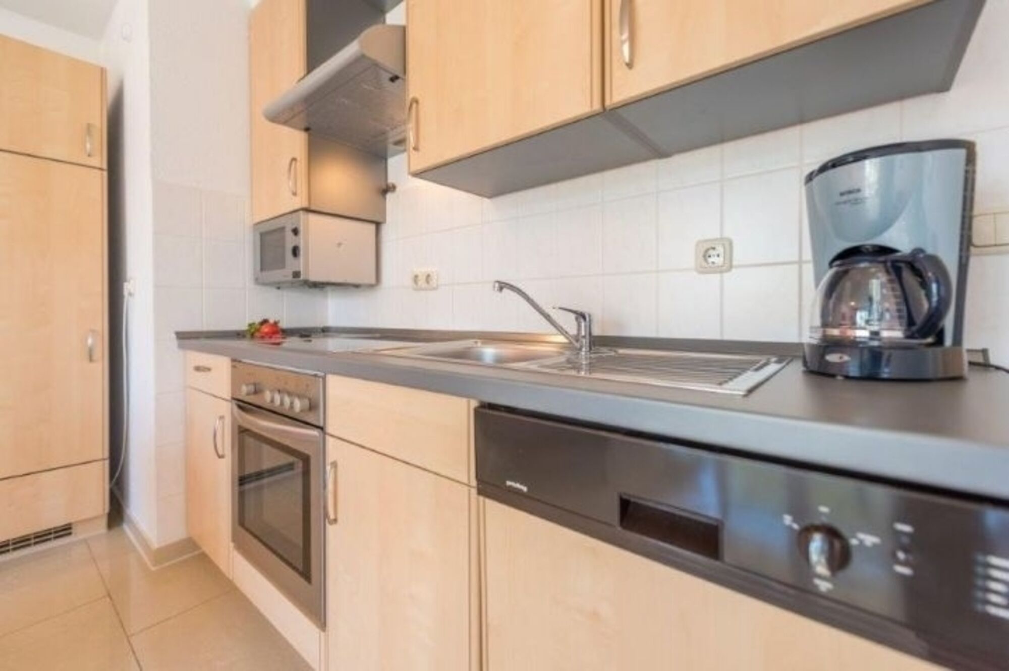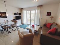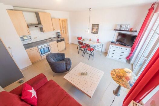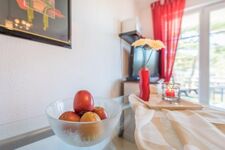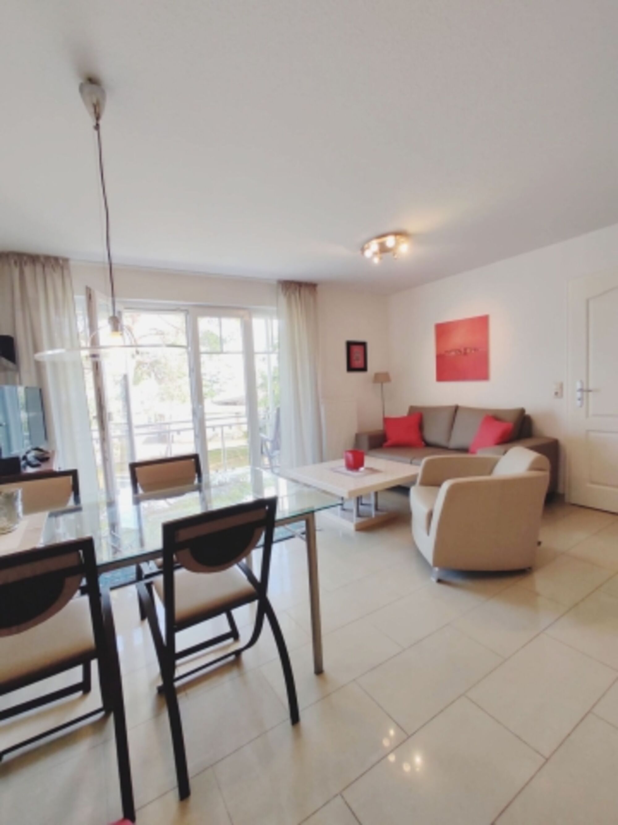Die Ferienwohnung "Rubin" ist eine 2 Zimmer Wohnung und misst 58 qm. Sie verfügt über ein Wohnzimmer mit ausziehbarer Schlafcouch, einem Schlafzimmer mit großem Bett 1,80x2,00m, einer Einbauküche und einem Duschbad. Ein großer Balkon mit Blick zum Kurpark und dem Meer. Zur Wohnung gehört ein Tiefgaragenstellplatz.