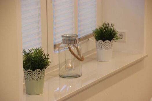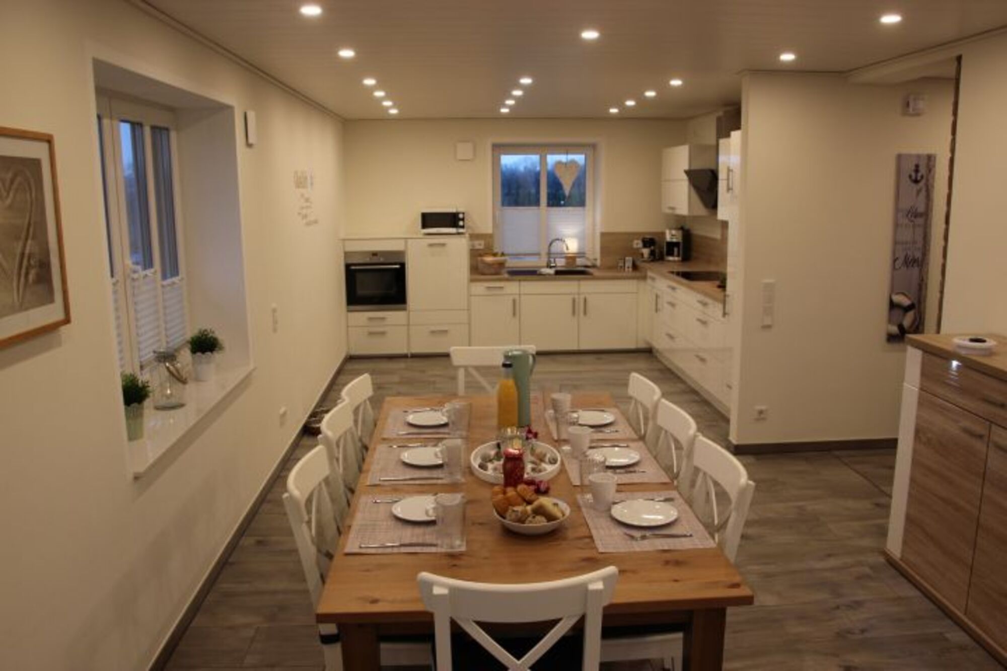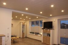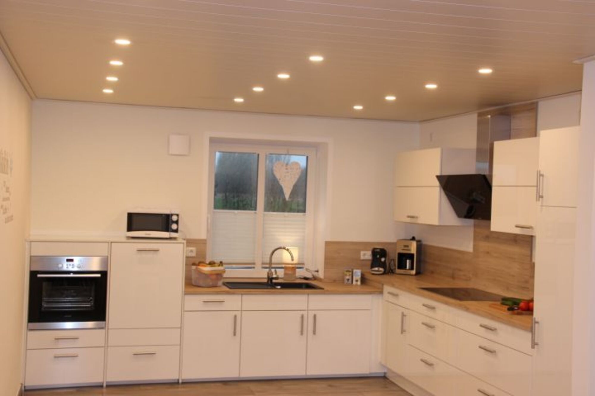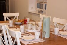 Cerankochfeld, Dunstabzugshaube, Kühlschrank mit Gefrierfach, Tassimo-Kaffeautomat, Mixer, Gewürze (Salz, Pfeffer, Zucker), Geschirrhandtücher, Mülltüten, Essplatz in der Küche