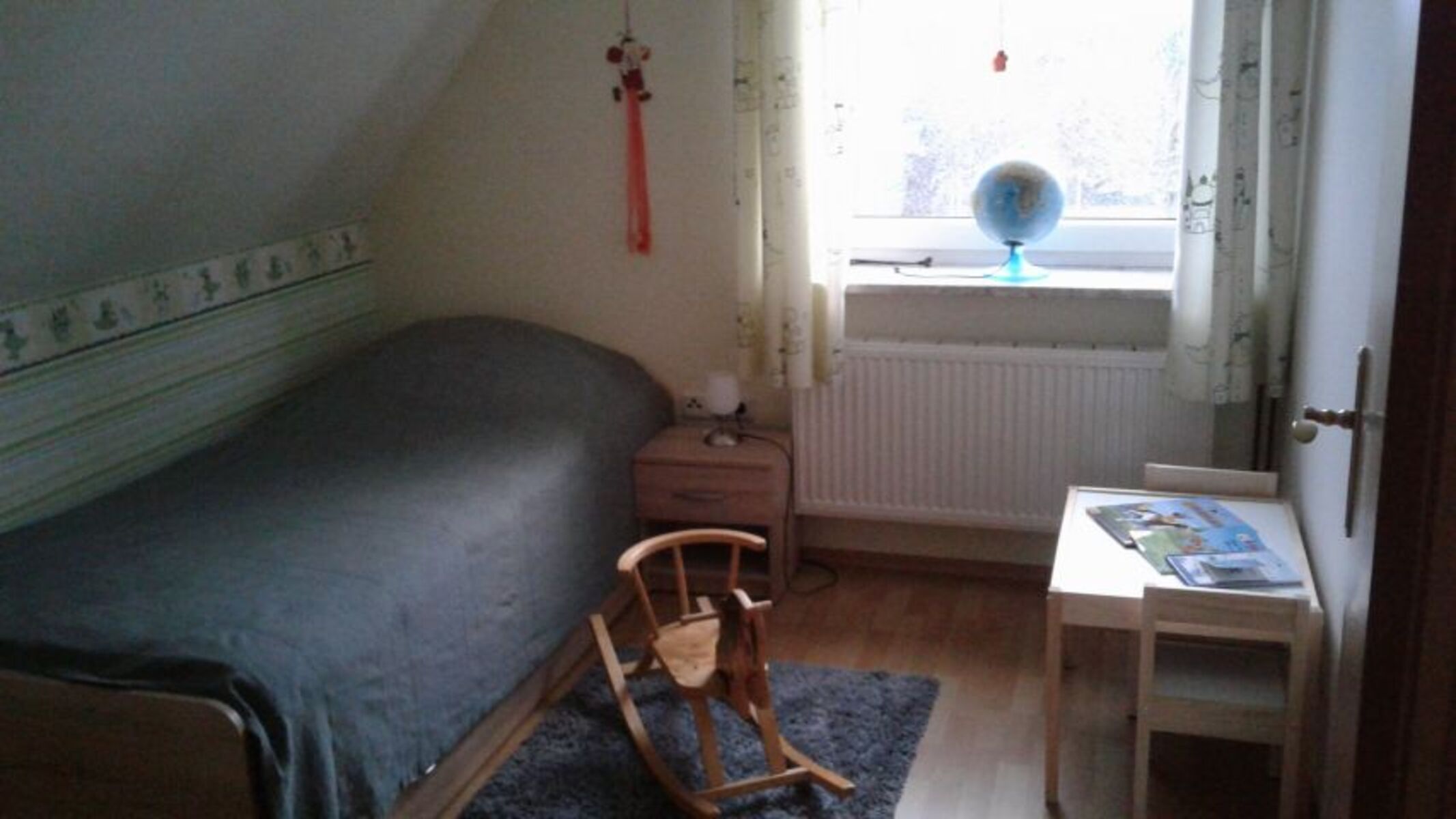 Das Bett lässt sich ausziehen. Einzelbett, Kommode, Leselampe am Bett