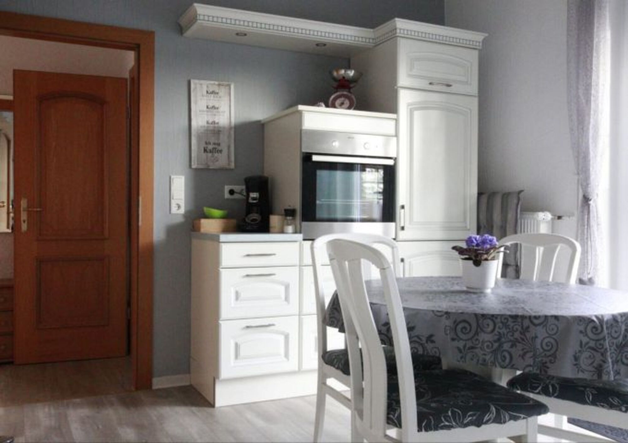 Gasofen / Gasherd, Dunstabzugshaube, Gefrierschrank, Senseo-Kaffeeautomat, Korkenzieher / Flaschenöffner, Gewürze (Salz, Pfeffer, Zucker), Öl / Essig, Geschirrhandtücher, Mülltüten, Essplatz in der Küche