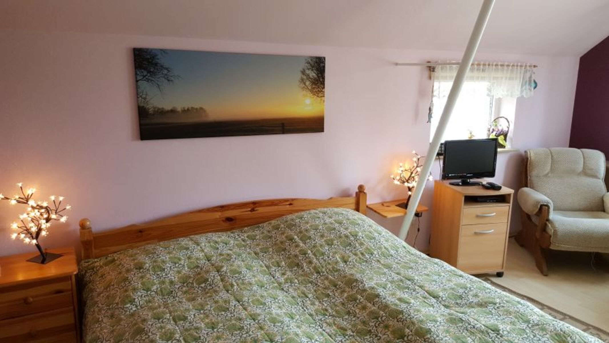 Bettdecken und Kissen sind vorhanden. Auf Wunsch werden Bettbezüge und Handtücher zur Verfügung bestellt für €8,50 pro Person Doppelbett 1,80 x 2,00m, Kommode, Leselampe am Bett