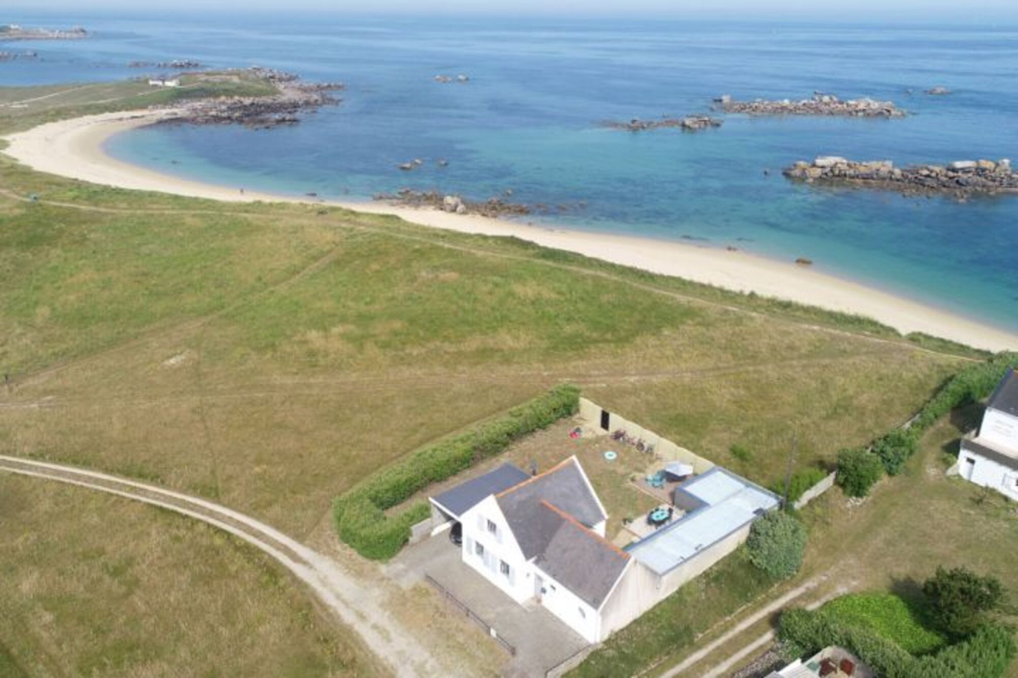Ein super Ferienhaus in der Bretagne, mit Blick auf das Meer, nur 37 Meter bis zum traumhaften Strand. Hier ist ein Paradies für alle : Kinder, Eltern und natürlich für Hunde. Hunde dürfen natürlich mit zum Strand. Das ist ein Traum und Sie sind alleine dort.
