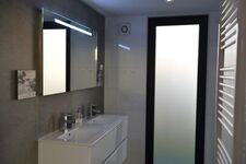 Doppelwaschbecken, Regendusche, Spiegel, Fenster im Bad