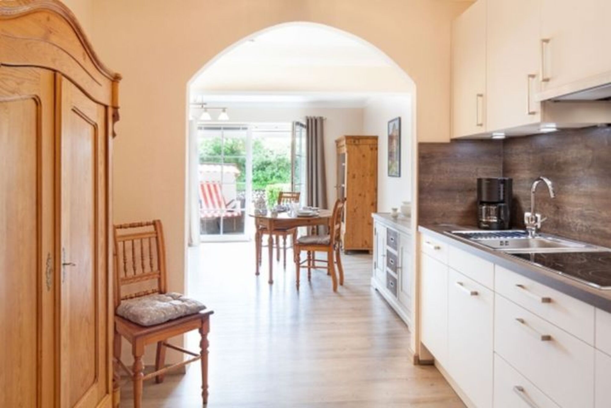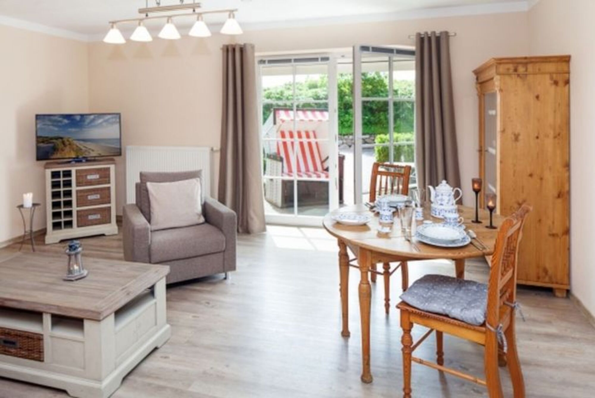 Helles Appartement mit kleiner Terrasse und Strandkorb im Erdgeschoss