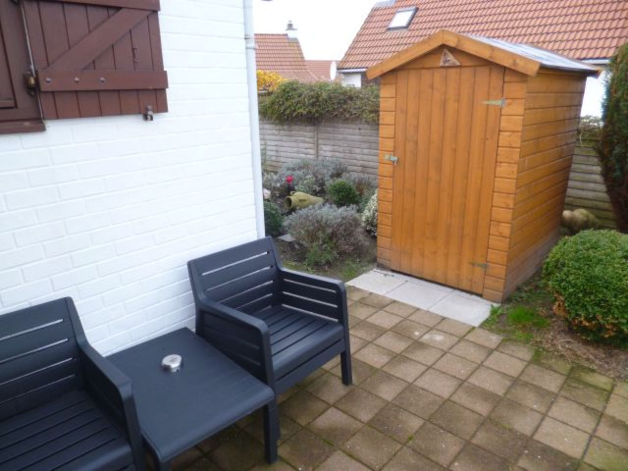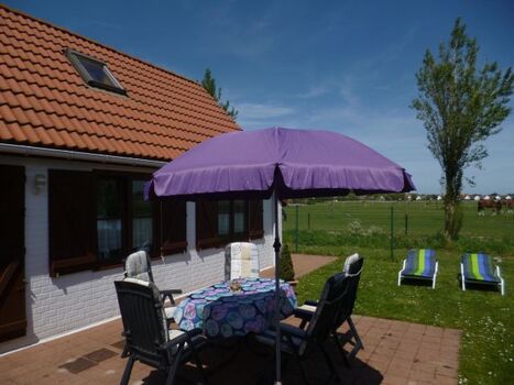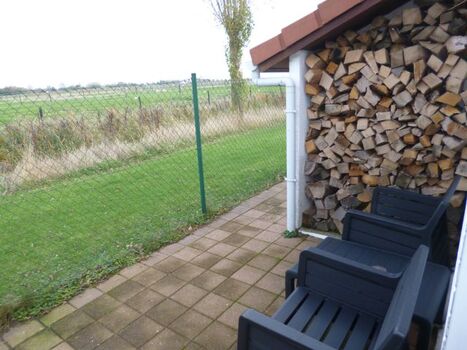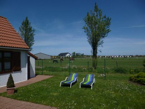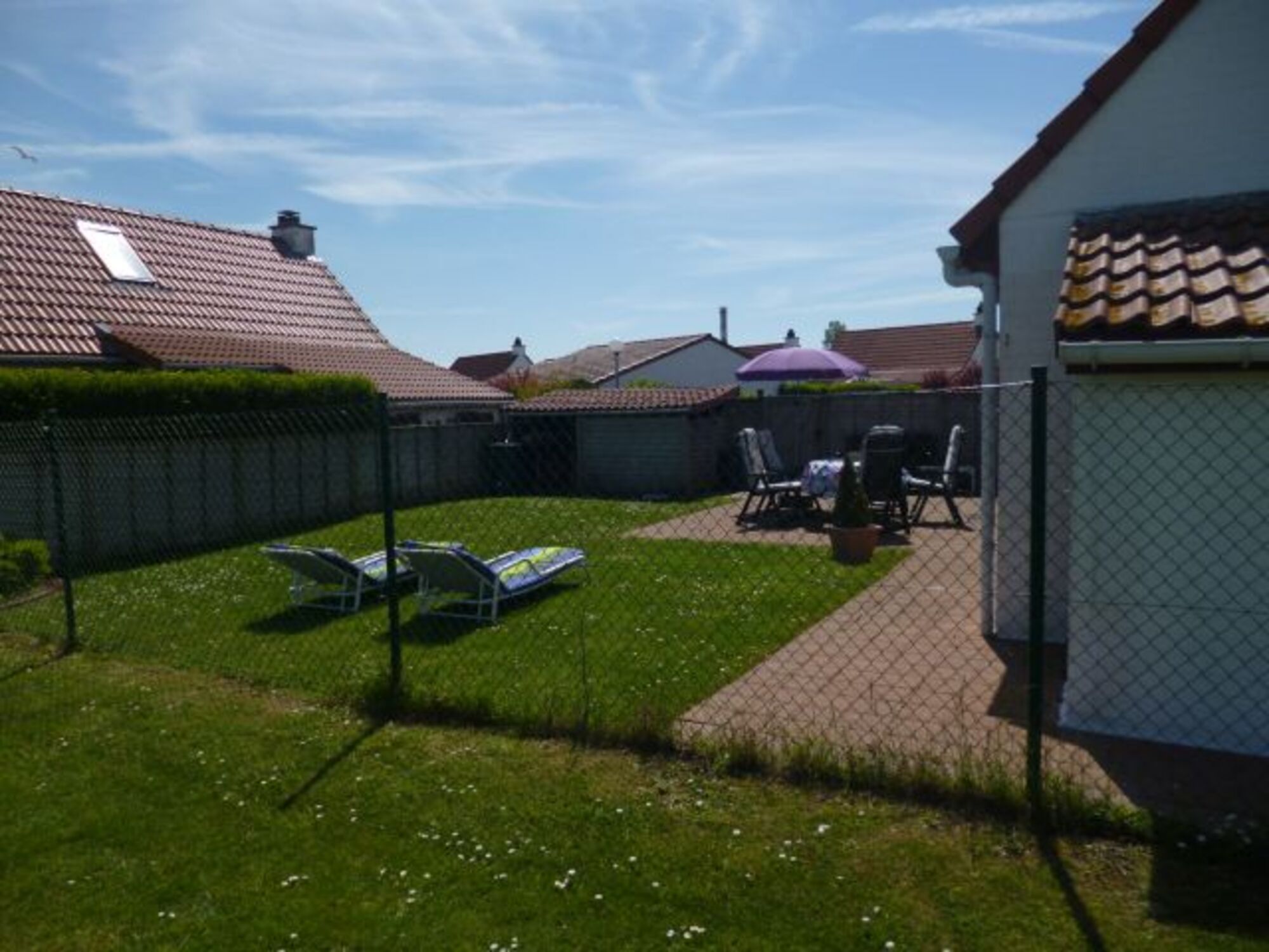 Der eingezäunte Garten verfügt über eine große Terrasse mit Gartenmöbeln und Sonnenliegen.