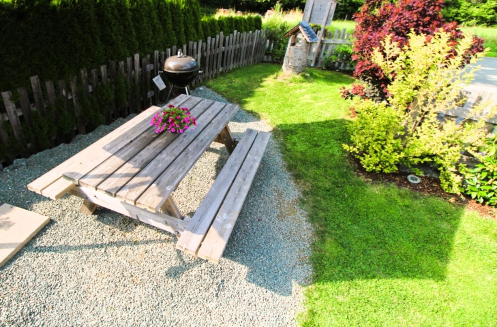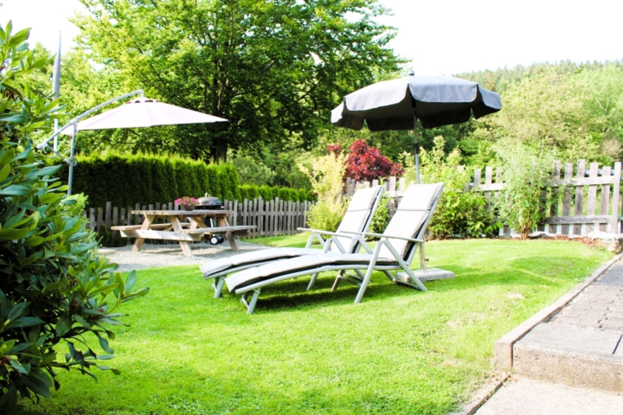 Ihr Hund wird den eingezäunten Garten lieben! Während er sicher draußen herum schnuppert, entspannen Sie auf den Sonnenliegen. Von hier führt Sie nur ein kleiner Schritt hinaus in Wald und Feld – die Natur liegt Ihnen buchstäblich zu Füßen.