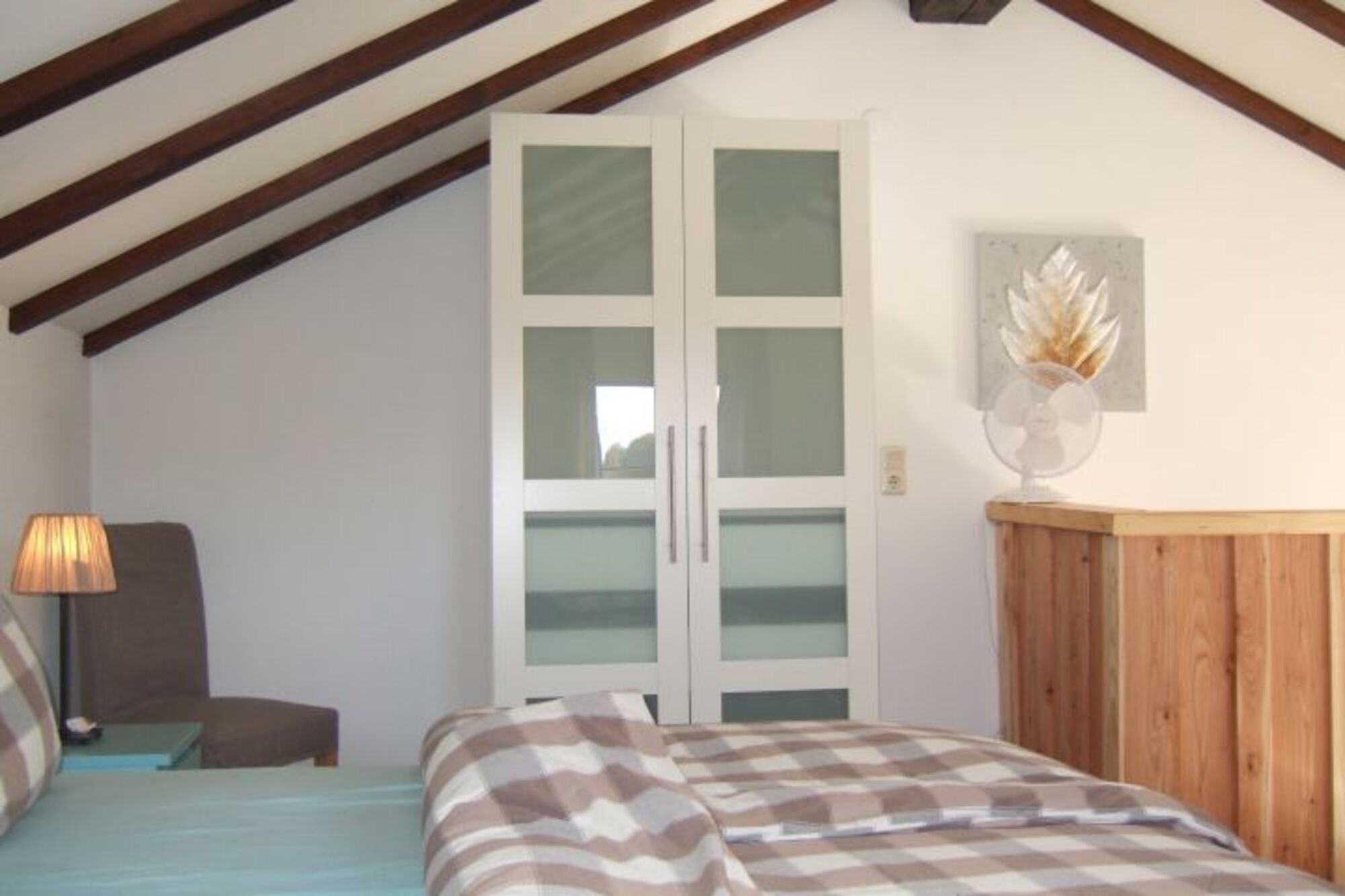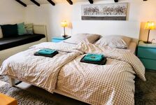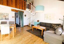Die offene Galerie im Obergeschoss sorgt mit einen ganz besonderen Charme für Heuboden-Feeling – natürlich mit allem Komfort einer modernen Ferienunterkunft. Der Schlafbereich strahlt Wärme und Gemütlichkeit aus und bietet Platz für 2 bis 4 Personen. Neben einem Doppelbett finden Sie dort ein Tagesbett, das sich bei Bedarf zu einem weiteren Doppelbett ausziehen lässt – ideal für Paare, kleine Familien oder Freundinnen, die gemeinsam reisen.