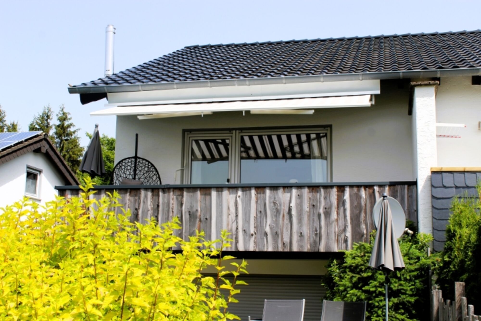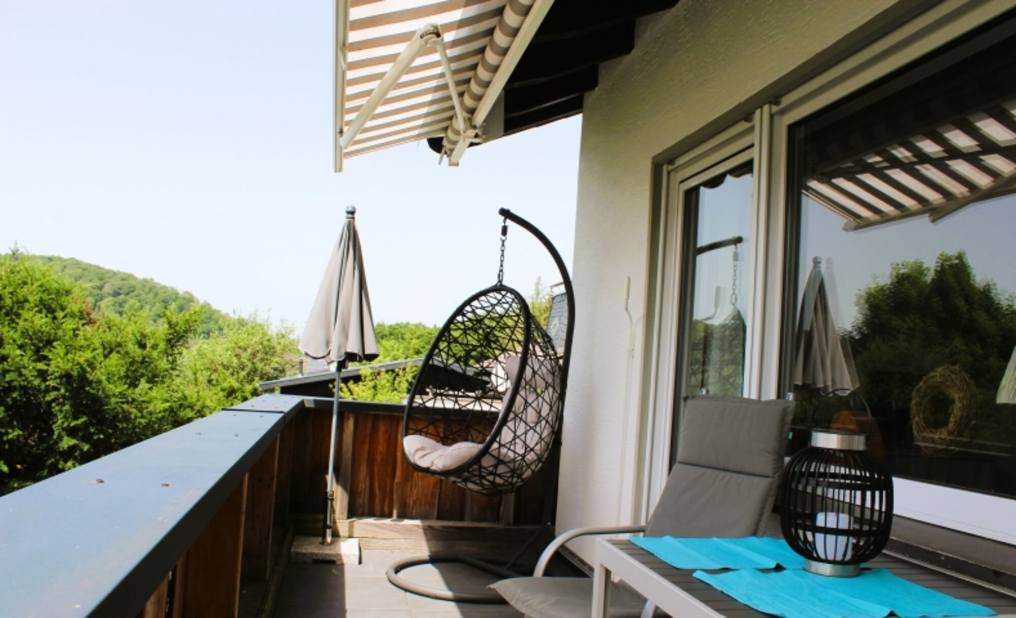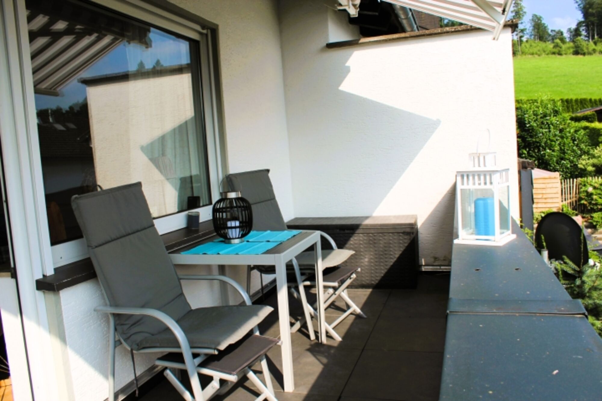 Vom Wohnzimmer geht es hinaus auf den Südbalkon mit Markise: genießen Sie den traumhaften Blick auf die imposanten Bruchhauser Steine und lassen Sie sich von der Abendsonne verwöhnen, die hier am Berg noch lange scheint, wenn das Tal bereits im Schatten liegt.