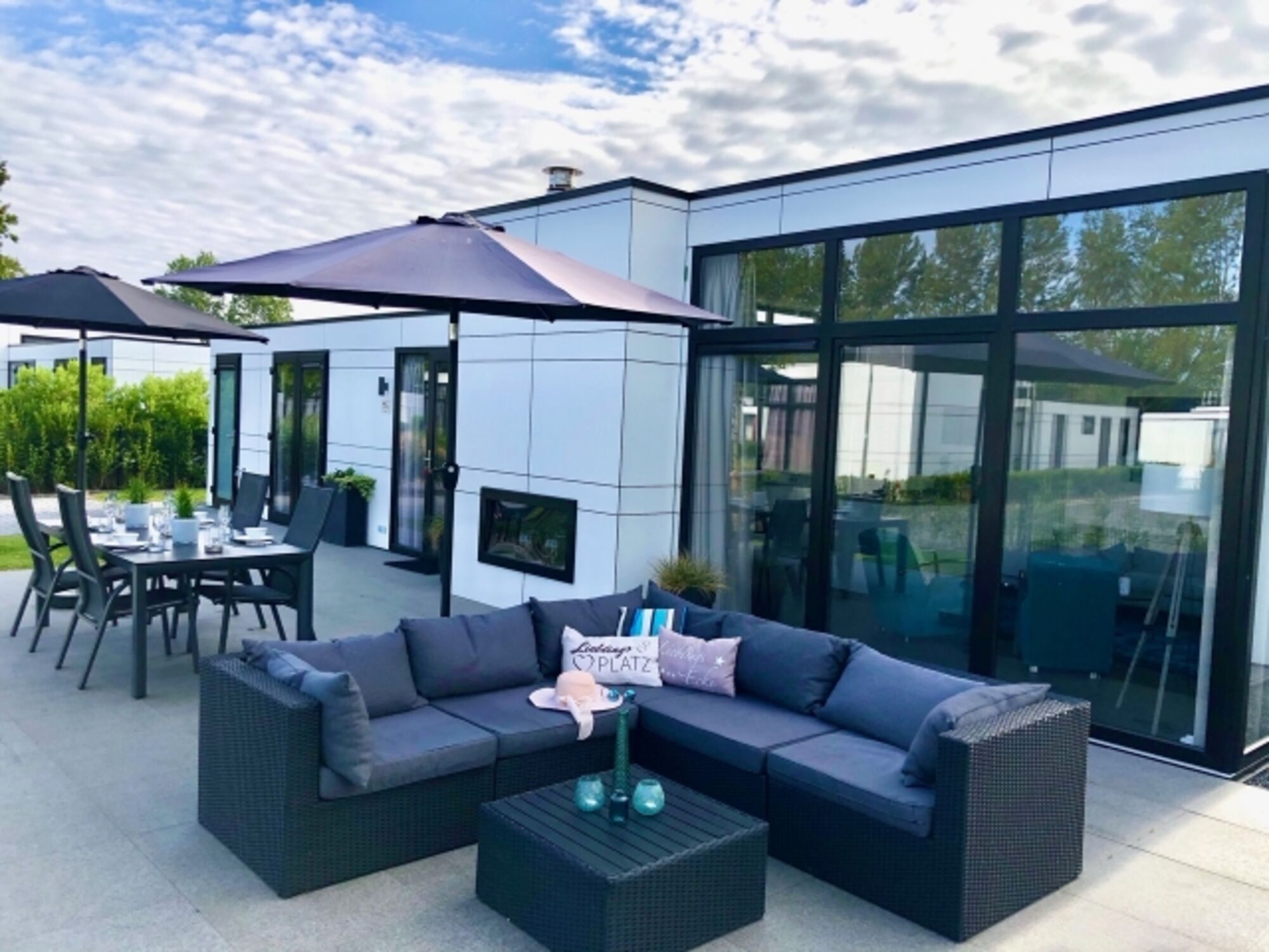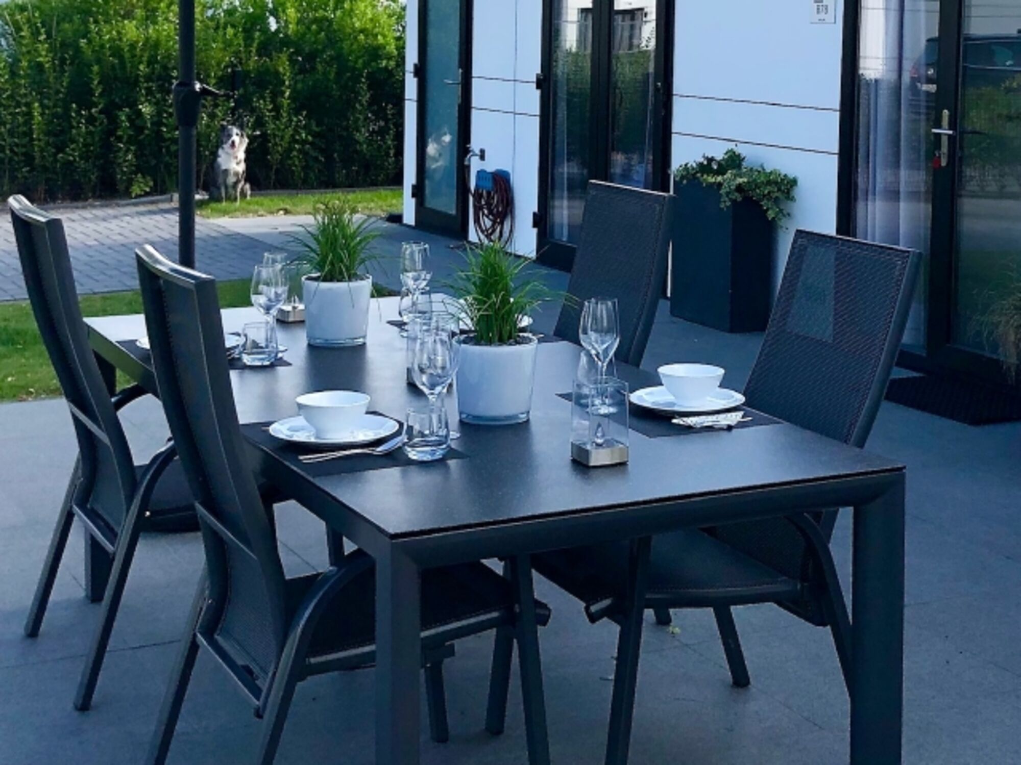 Der Außenbereich bietet eine große Sonnenterrasse sowie Rasenflächen zum Spielen, Toben und Sonnenbaden.