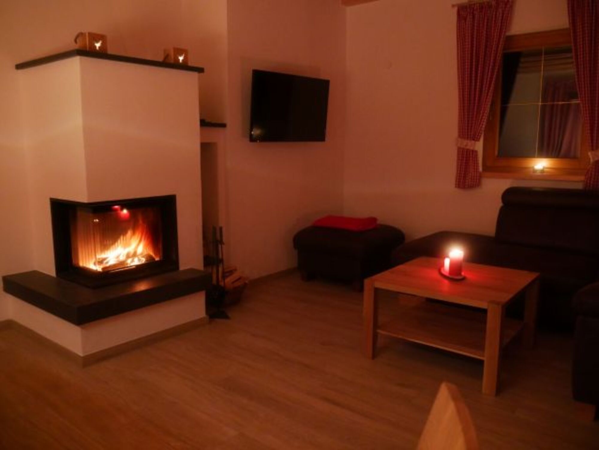TV-Flachbildschirm, Kaminofen, Eckcouch, 3er-Sofa
