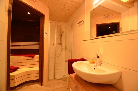 Das Badezimmer im Erdgeschoß verfügt neben Dusche, WC und Waschbecken über eine Sauna.