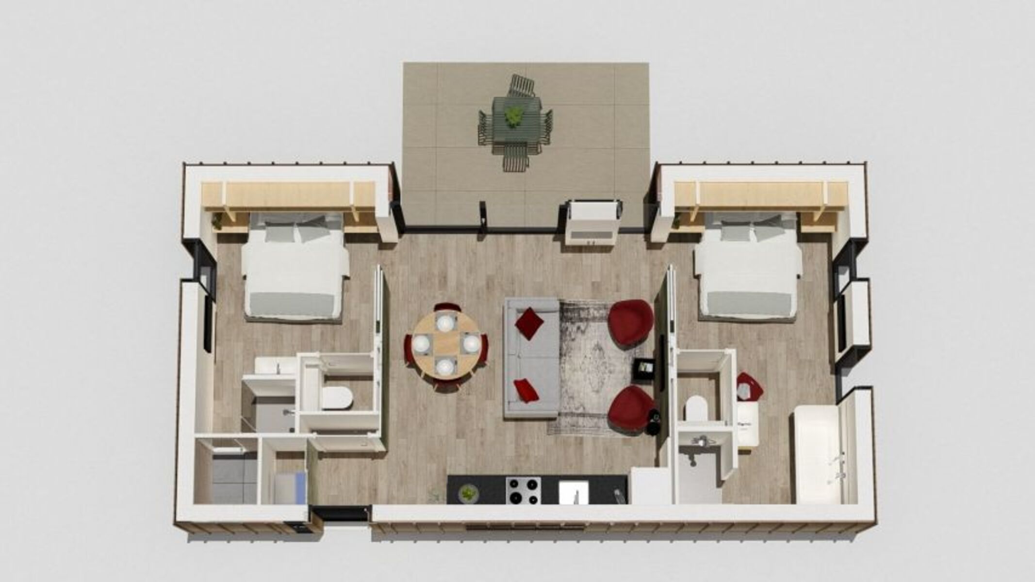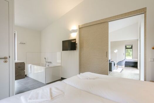 Zu beiden Seiten des Wohnzimmers liegen die zwei Schlafzimmer mit je eigenem Badezimmer. Beide Schlafzimmer lassen sich mit Schiebetüren schließen oder öffnen und ins Wohnzimmer integrieren. Das erste Schlafzimmer verfügt über ein Doppelbett, einen Flachbildfernseher und eine hübsche freistehende Badewanne. Dazu kommt eine Dusche und ein separates WC. Im zweiten Schlafzimmer mit Doppelbett steht Ihnen auch eine Dusche und eine separate Toilette zur Verfügung.