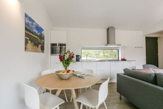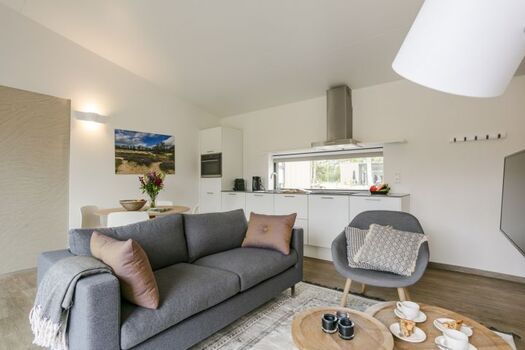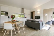 Das sehr komfortabel eingerichtete Wohnzimmer ist aufgrund der großen Giebelverglasung schön lichthell. Das Wohnzimmer verfügt über eine gemütliche Sitzecke mit Flachbildfernseher und rundem Esstisch. Die moderne Kücheneinrichtung ist sehr komplett und es stehen unter anderem Induktionsherd, Geschirrspüler, Nespresso-Maschine und Kombiofen zur Verfügung.