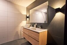 Im Erdgeschoss befindet sich ein geräumiges Schlafzimmer mit zwei einzelnen Boxspringbetten. Durch die Flügeltüren gelangen Sie auf die Terrasse mit Blick auf das Wasser. Hier können Sie mit dem Geräusch von plätscherndem Wasser aufwachen. Das eigene Badezimmer hat eine Dusche, die Toilette ist separat.