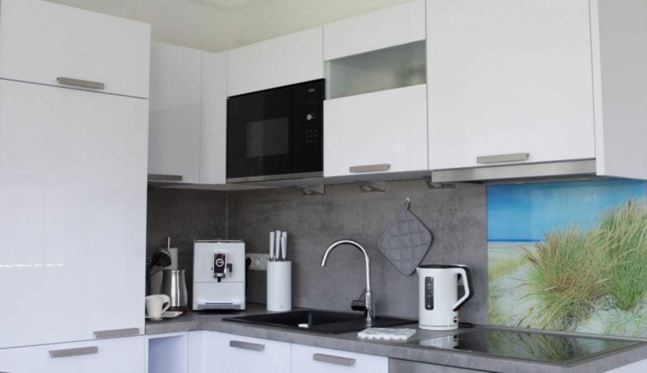 Cerankochfeld, Dunstabzugshaube, Kühlschrank mit Gefrierfach, Gefrierschrank, Kaffeevollautomat, Küchenmaschine, Mixer, Korkenzieher / Flaschenöffner, Gewürze (Salz, Pfeffer, Zucker), Öl / Essig, Geschirrhandtücher, Mülltüten, Essplatz in der Küche