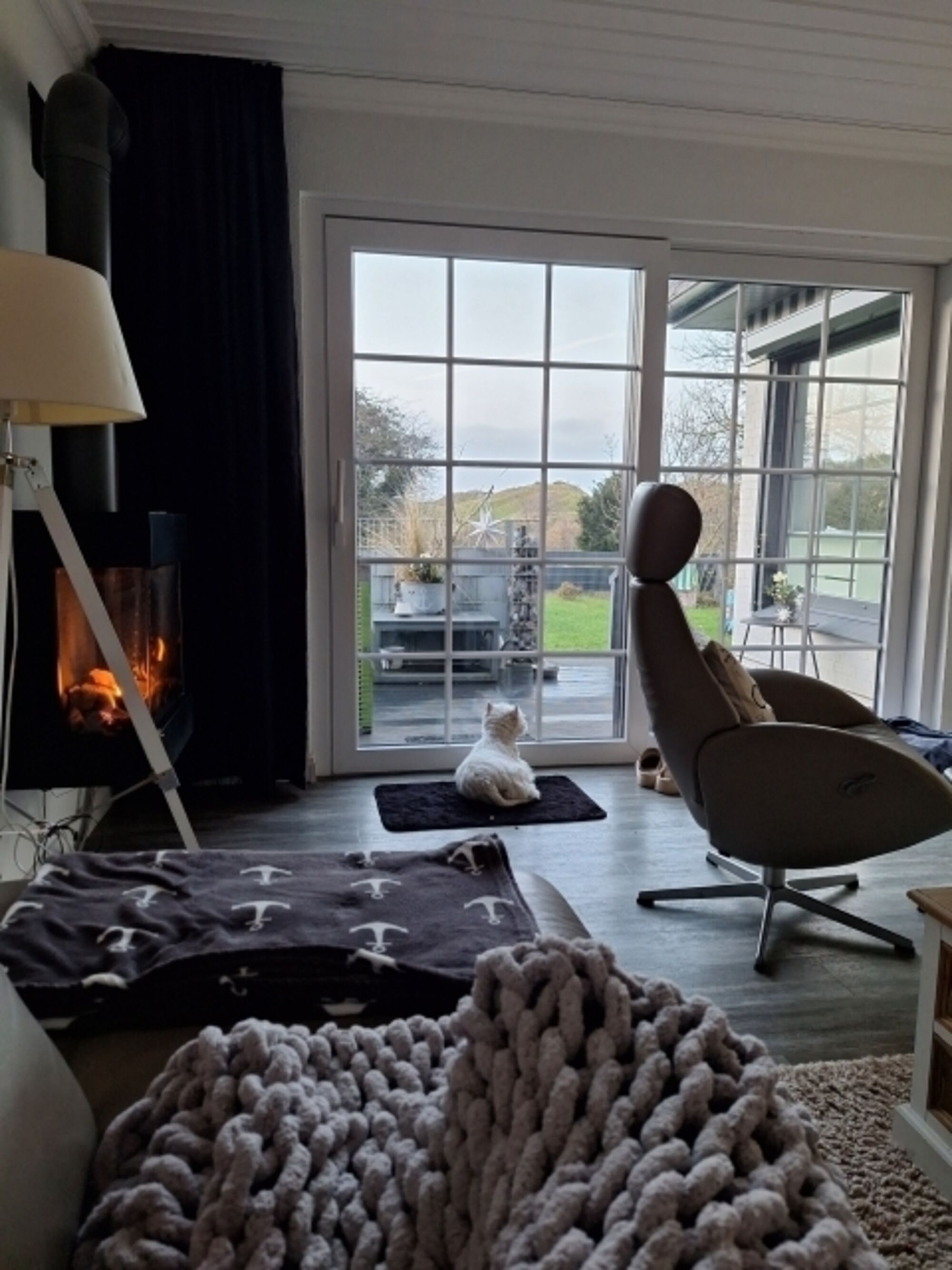 TV-Kabel, TV-Sat, Sky, TV-Flachbildschirm, HDTV Flachbildschirm, Bücher, Kaminofen, 3er-Sofa, Sessel