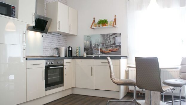 Teil der Villa-Cues. Es erwartet Sie trotz der zentralen Lage eine angenehm ruhige und komplett eingerichtete Ferienwohnung, in dem Sie sich sofort wie Zuhause fühlen werden.