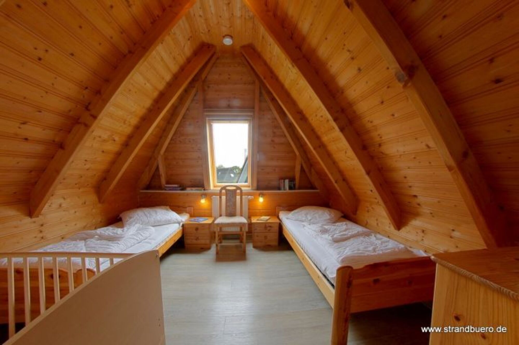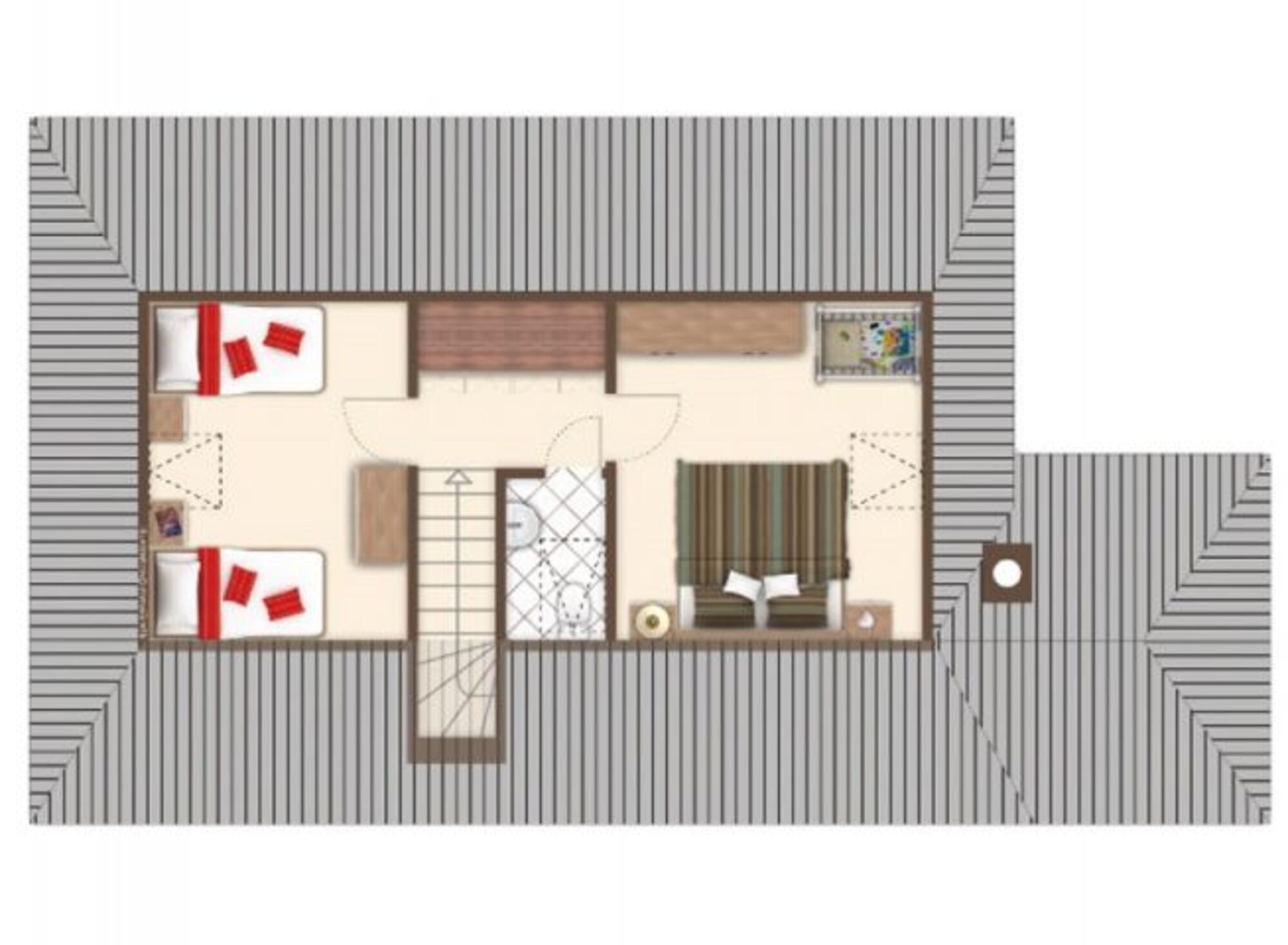 Im unteren Bereich befindet sich ein Schlafraum mit zwei Einzelbetten und einem Schrank. Gleich gegenüber ist das Duschbad mit Waschmaschine. Im Anschluss der große Wohnraum mit Küche und Essplatz.