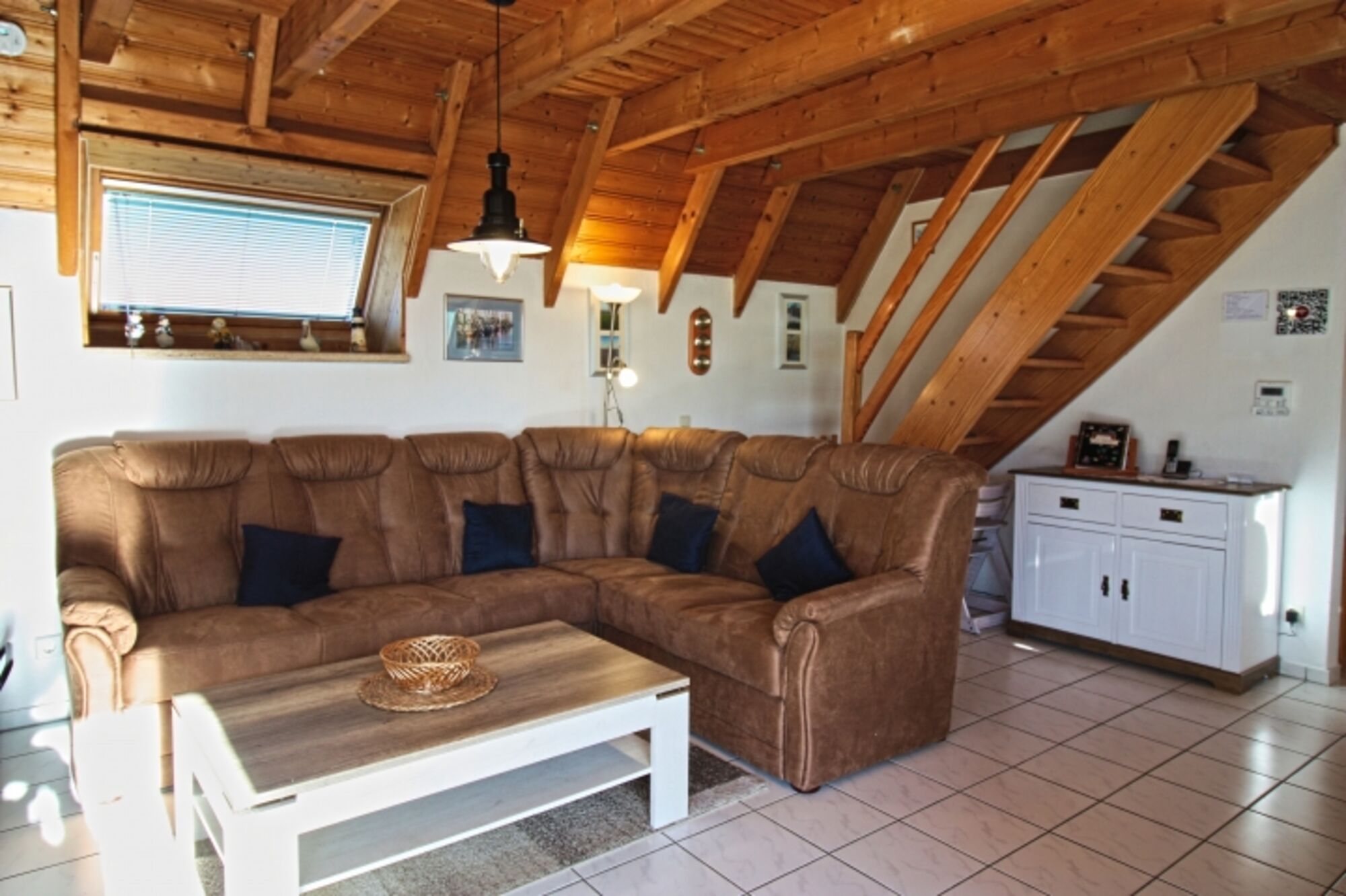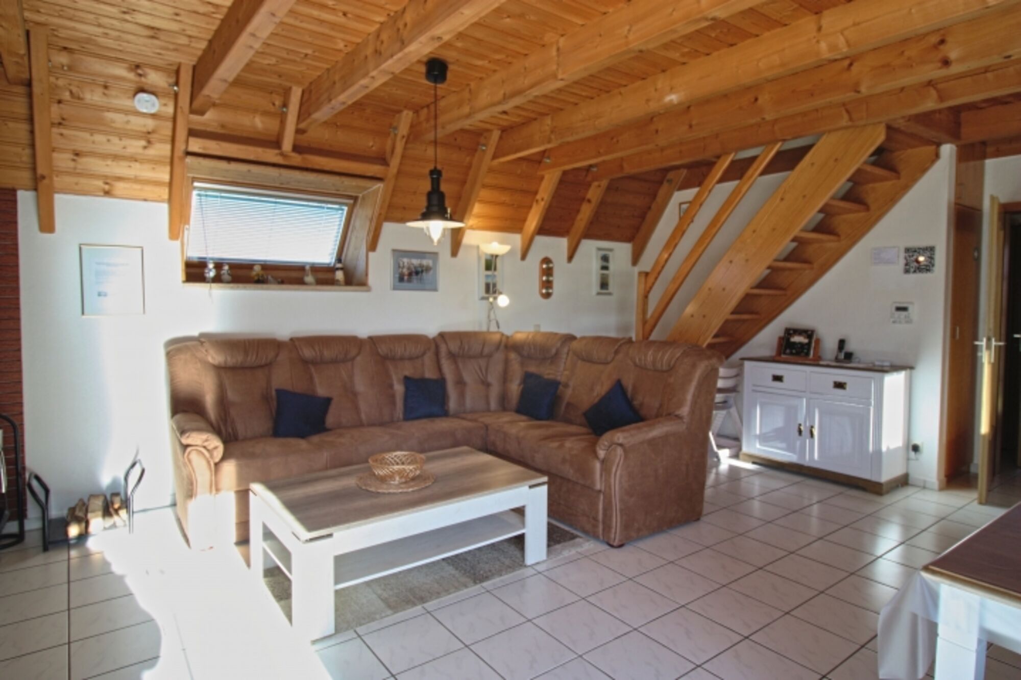Für gemütliche Stunden steht die bequeme Rundsitzcouch bereit. Der LCD Fernseher, Radio Anlage zum Abspielen von Sticks-Audio DVDs-CDs-CD RS-MP3-WMA CDs, sind vorhanden. Sollte es am Abend mal kühler werden, oder im Winter, sorgt der Kaminofen für eine entsprechende Atmosphäre. Die überdachte und geschützte Terrasse mit ausreichend Bestuhlung und Tisch, Liegen, Auflagen und einem Grillkamin erreichen sie vom Wohnraum aus. Über eine Treppe mit beidseitigem Schutzgitter für die Kleinen, gelangen sie in die obere Etage.