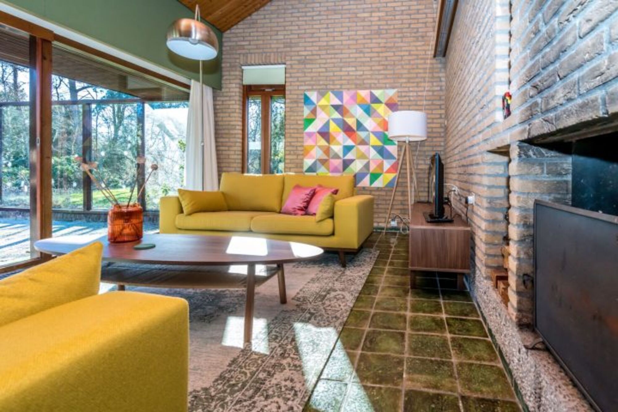 TV-Flachbildschirm, Offener Kamin, 2er-Sofa, Sessel