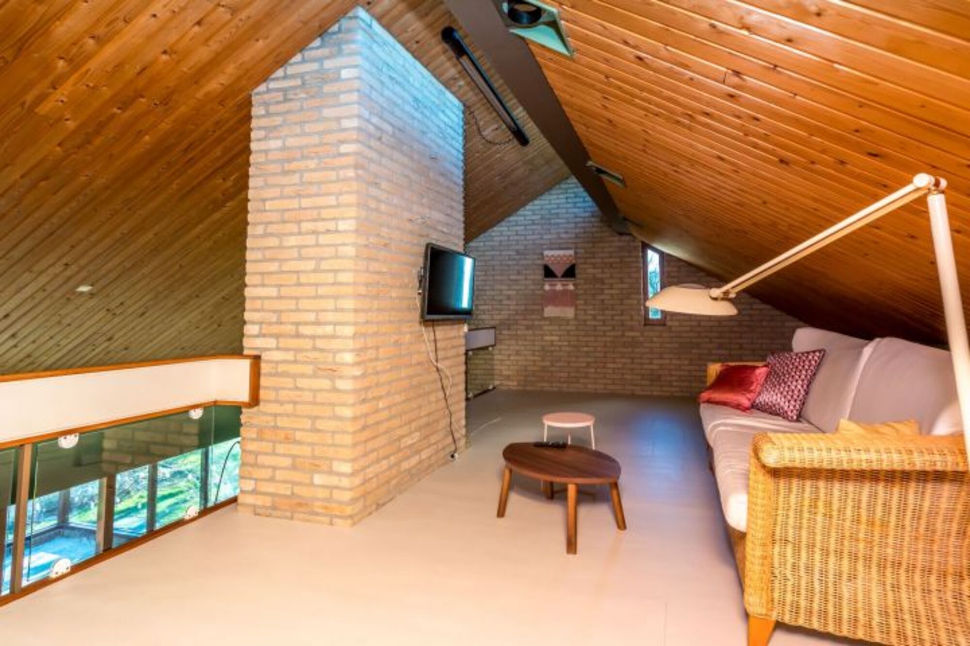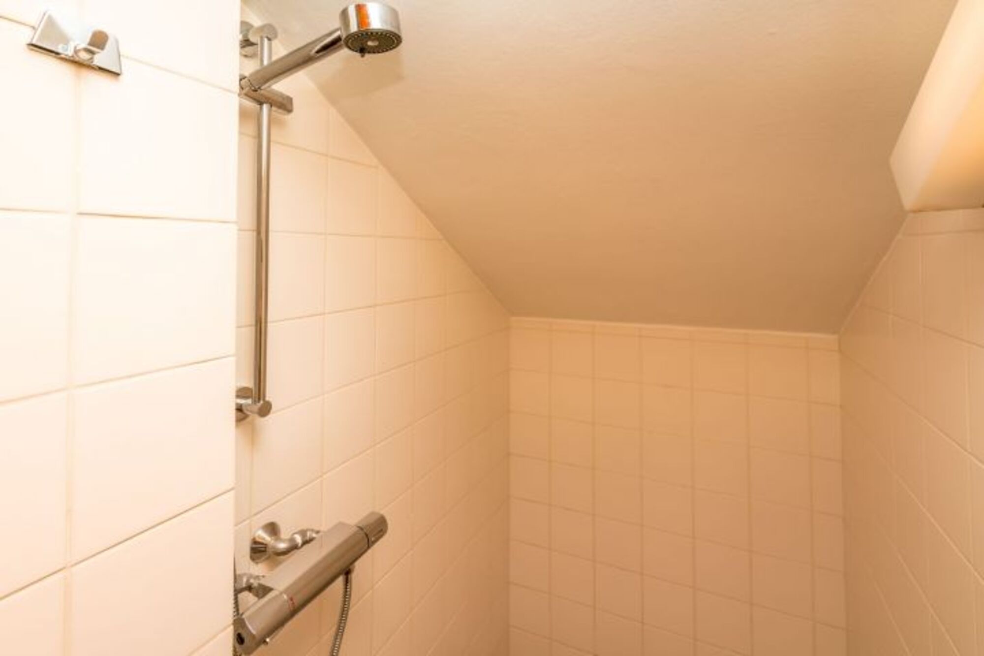 Über die Treppe (mit Treppengitter) im Wohnzimmer erreichen Sie das große Zwischengeschoss mit Sitzecke und Fernseher. Ein idealer Platz für Kinder. Die beiden Schlafzimmer auf der ersten Etage haben jeweils ein Einzelbett und eine Kommode. Außerdem gibt es eine Dusche und eine separate Toilette mit Waschbecken.