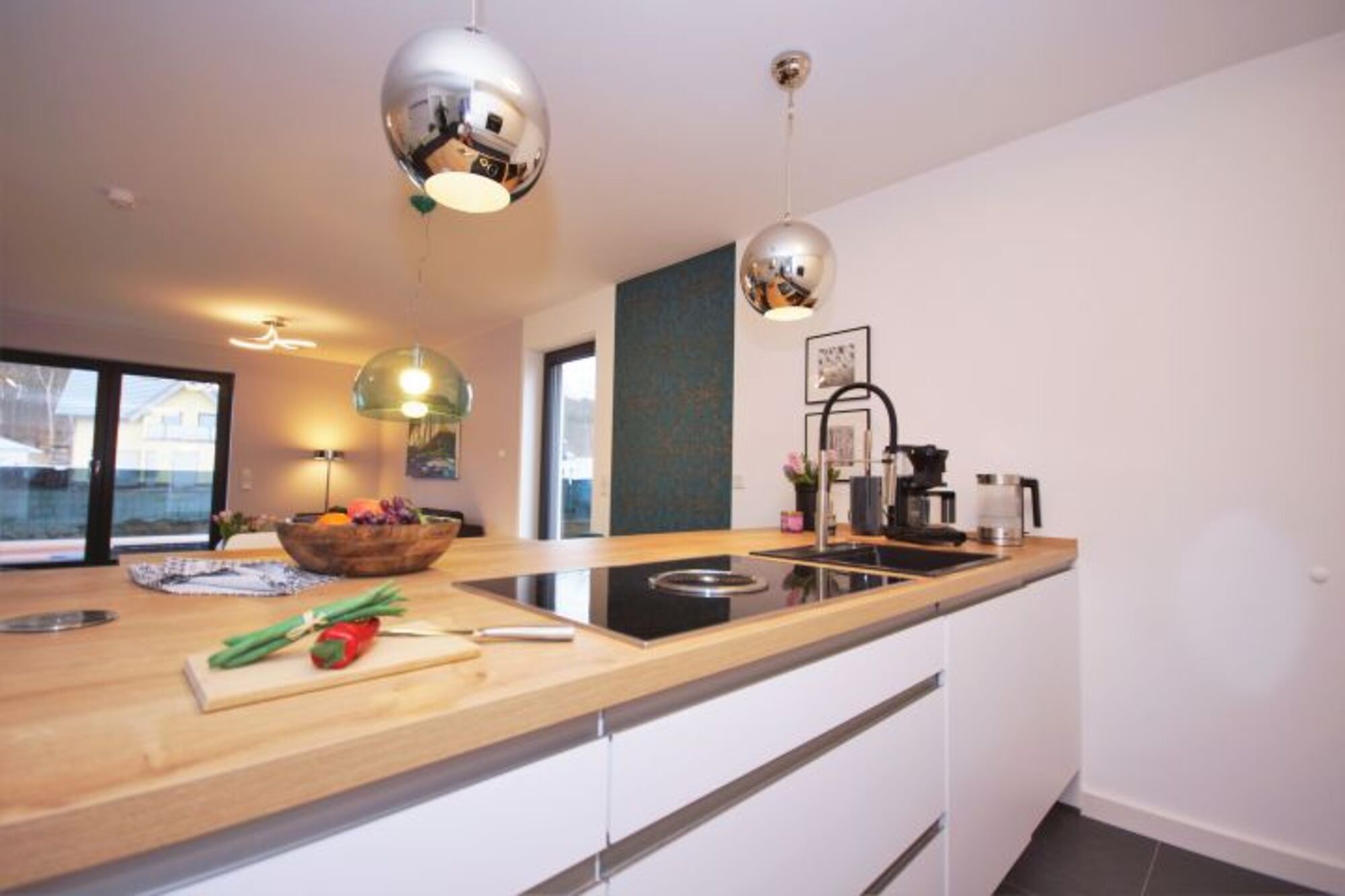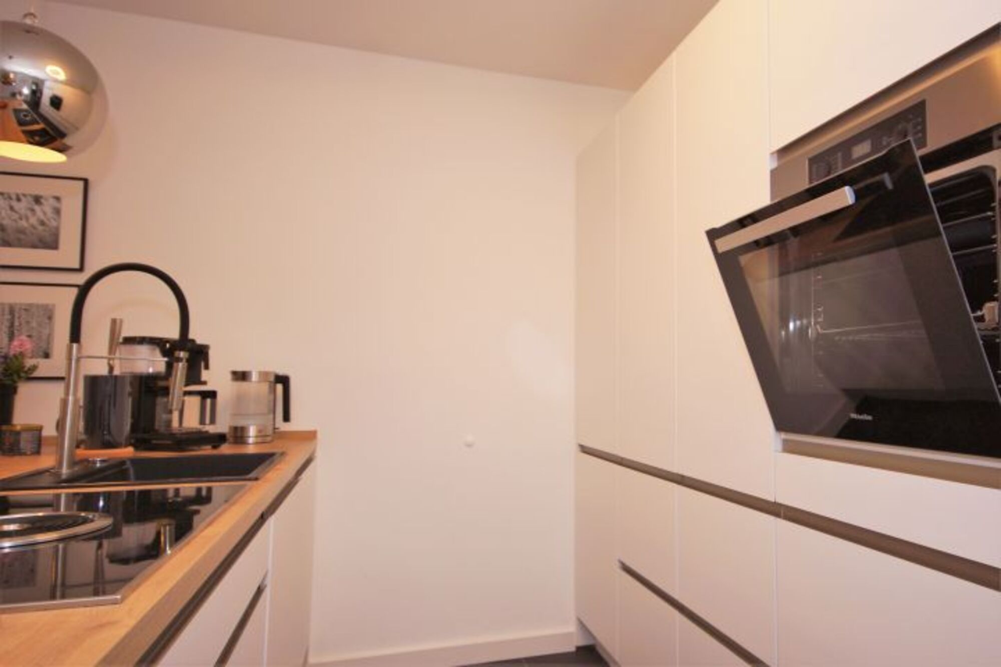 Induktionsherd, Dunstabzugshaube, Gefrierschrank, Kaffeevollautomat, Senseo-Kaffeeautomat, Geschirrhandtücher, Mülltüten, Essplatz in der Küche