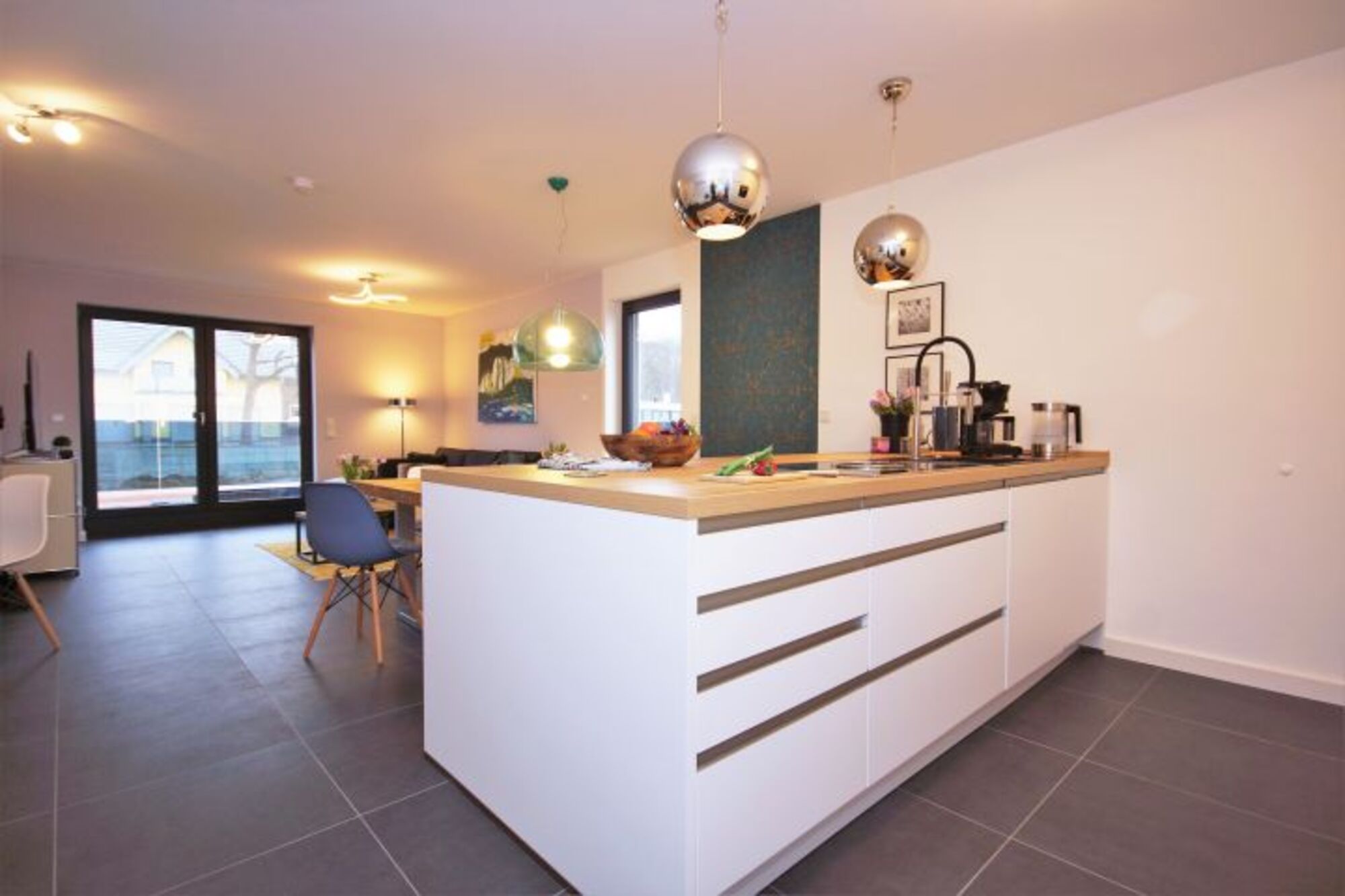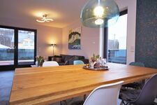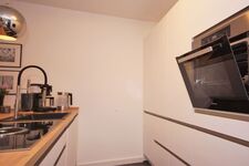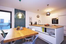 Betreten Sie die Ferienwohnung Loft im 3. Obergeschoss erwartet Sie eine traumhafte Atmosphäre zum Wohlfühlen und eine große Dachterrasse für den Genuss einer frischen Ostseebrise. Der freundliche Wohn- und Essbereich verfügt über eine hochwertige, voll ausgestattete Küche mit Kochinsel. Außerdem stehen Ihnen in der Küche besondere Accessoires zur Verfügung. Seien es eine Moccamaster-Kaffeemaschine, ein Senseo-Automat oder eine Kaffeemahlmaschine, hier schmeckt das beliebte Heißgetränk in der wohnlichen Umgebung ausgezeichnet. Für Freunde der kulinarischen Unabhängigkeit befindet sich außerdem ein Backofen, ein 4 Felder Induktionskochfeld, zahlreiche Töpfe und Pfannen für gemütliche Kochabende in der großen Küche.