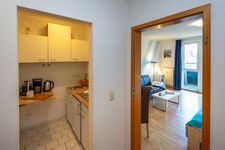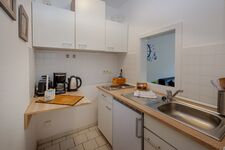 Die separate Küche mit offener Durchreiche verfügt über einen 2-Platten-Herd, einen Kühlschrank, eine Kaffeemaschine, Wasserkocher und Toaster sowie natürlich auch über das nötige Koch- und Essgeschirr.