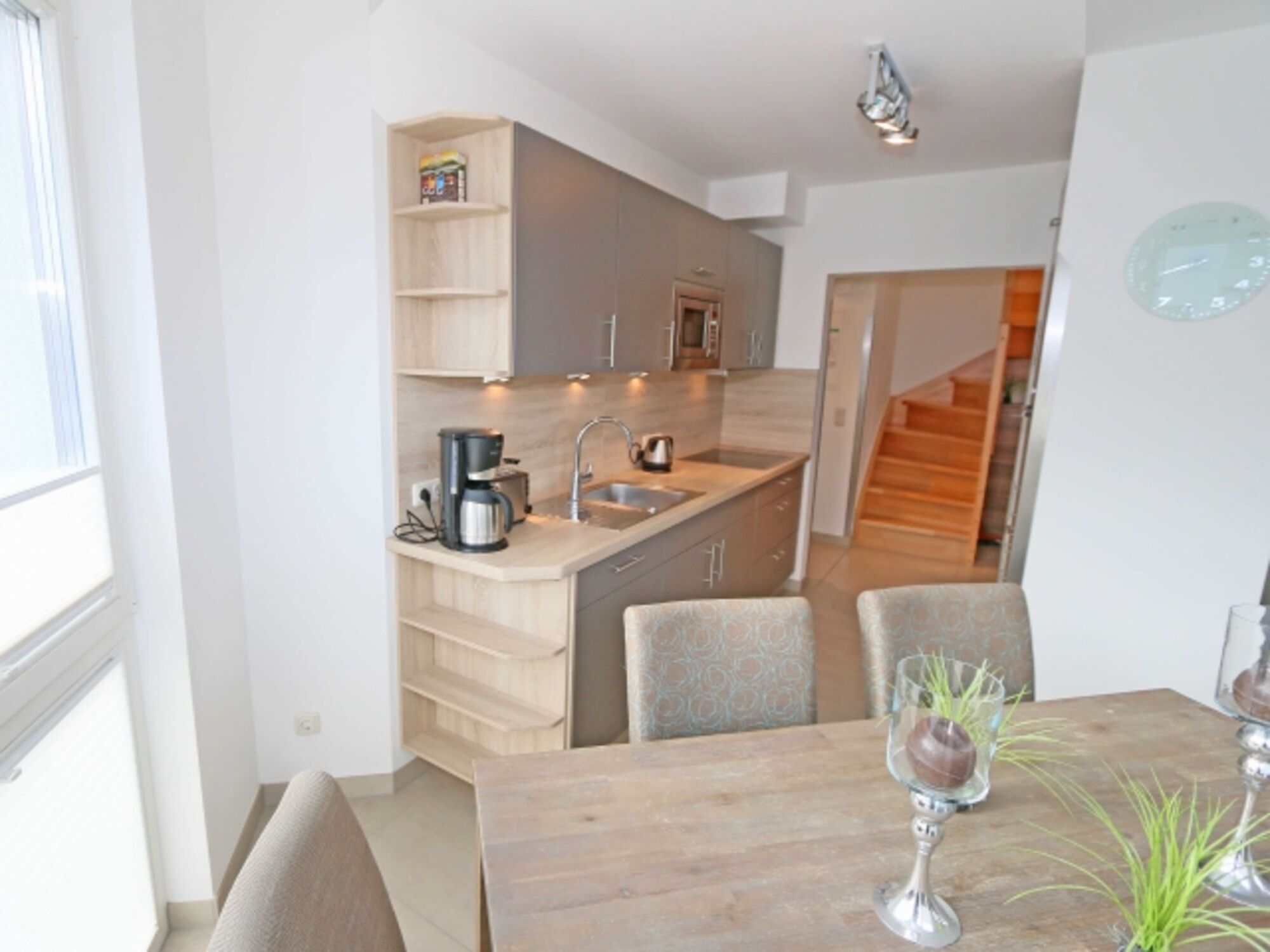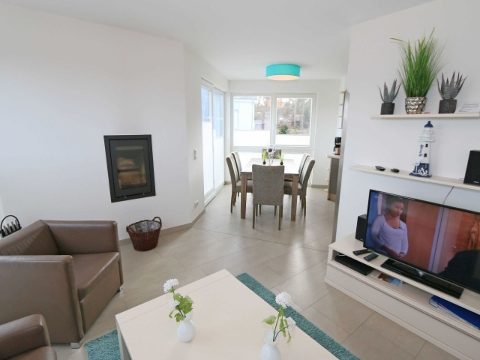 Im großräumigen Wohn-/Essbereich gibt es eine komfortable Couchecke, einen Flachbild-TV, einen Blu-Ray Player und eine Stereoanlage. Der Kamin sorgt für eine angenehme Atmosphäre in der kälteren Jahreszeit. Die Küchenzeile umfasst eine Waschmaschine, einen Geschirrspüler, einen Kühlschrank mit Gefrierfach, einen Backofen, ein 4-Zonen-Cerankochfeld, eine Mikrowelle, eine Kaffeemaschine, einen Toaster, einen Wasserkocher und diverse Küchenutensilien. Der große Esstisch bietet Platz für 6 Personen. Der angrenzende Balkon mit Meerblick ist ein weiteres Highlight.