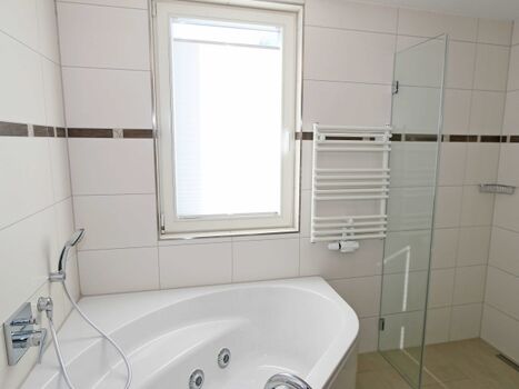 Badewanne mit Whirlpool, Waschbecken, Spiegel, Fenster im Bad