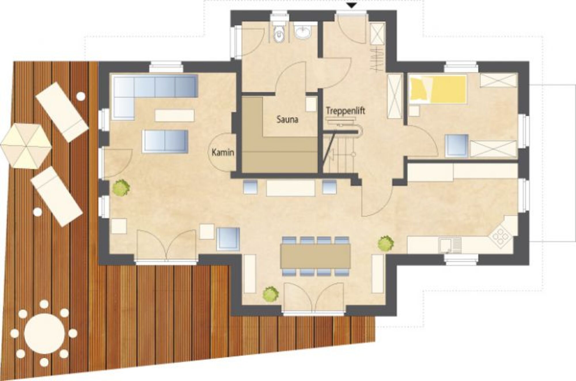 Barrierefreiheit: Stufenloser Zugang, Treppenlift (Plattformgröße 81 x 67 cm) und Pflegebett