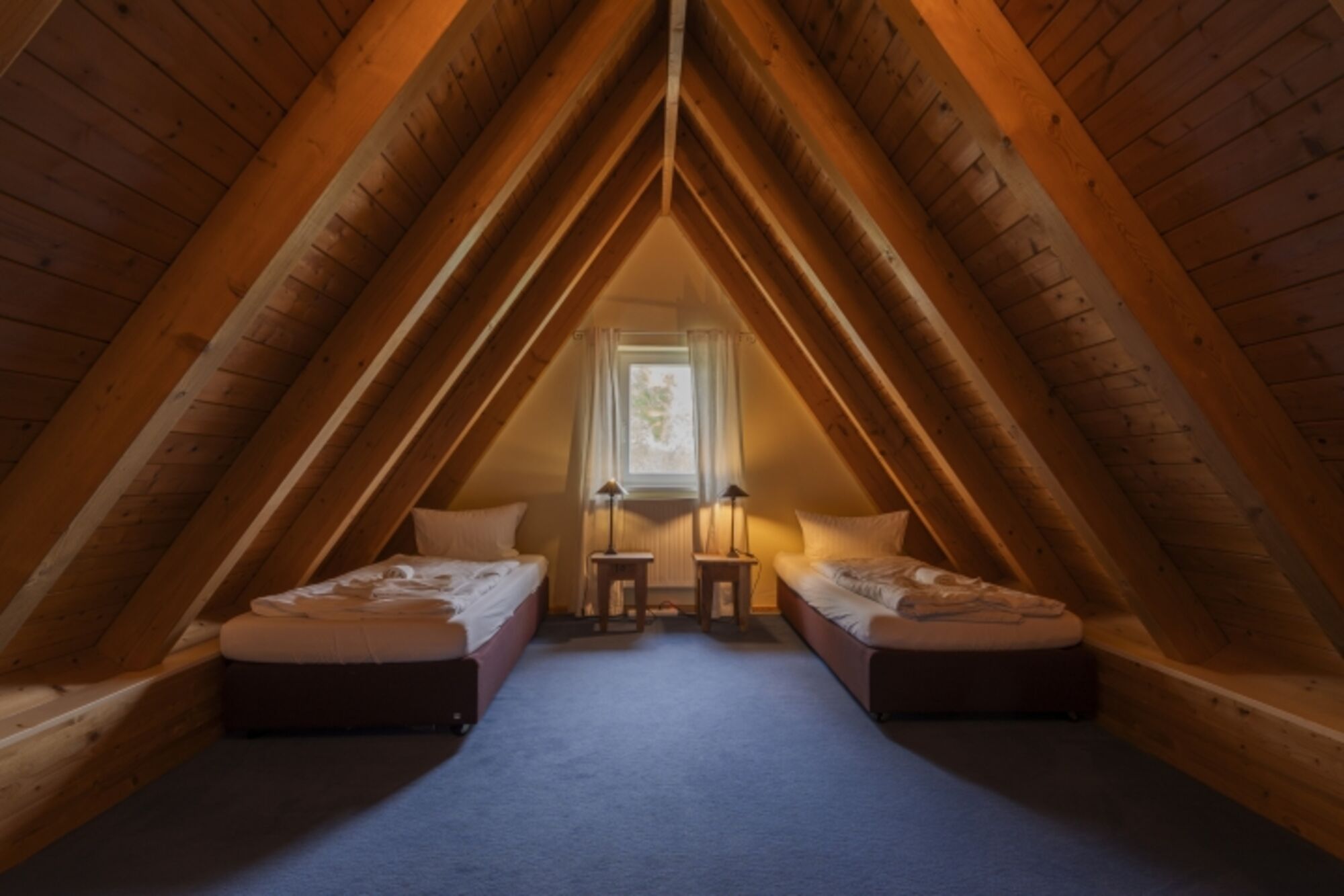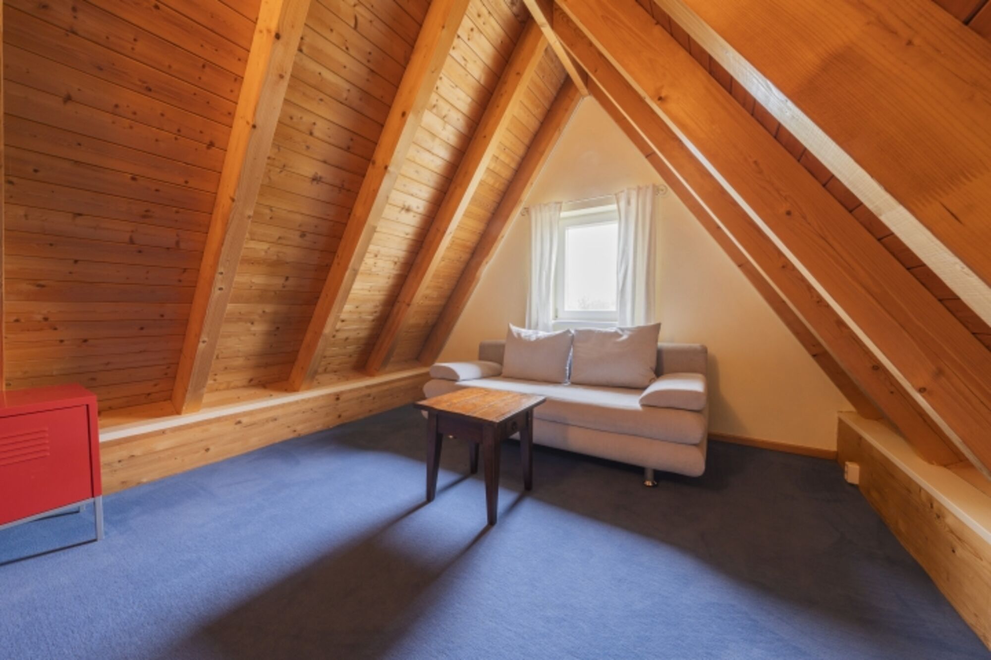 Spitzboden mit Doppelbett und Schlafcouch, über ein Schlafzimmer erreichbar