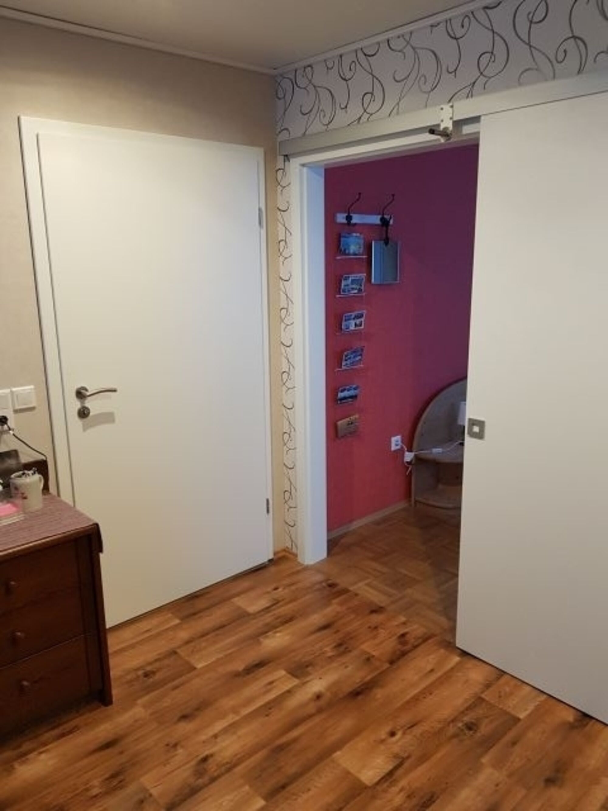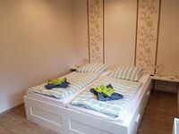 Ruhig und zentral gelegen. Wohn/Essbereich, Bad mit begehbarer Dusche/WC, Waschmaschine, 2 Schlafzimmer mit jeweils Doppelbetten, eine 5. Person könnte auf einem Gästebett/-hocker (ca. 70x190cm) schlafen, breite Türen, Terrasse, 2. TV-Gerät in einem Schlafzimmer. Die Außentür hat eine Breite von 85 cm. Im Ferienhaus haben die Türen eine Breite von 94 cm.
