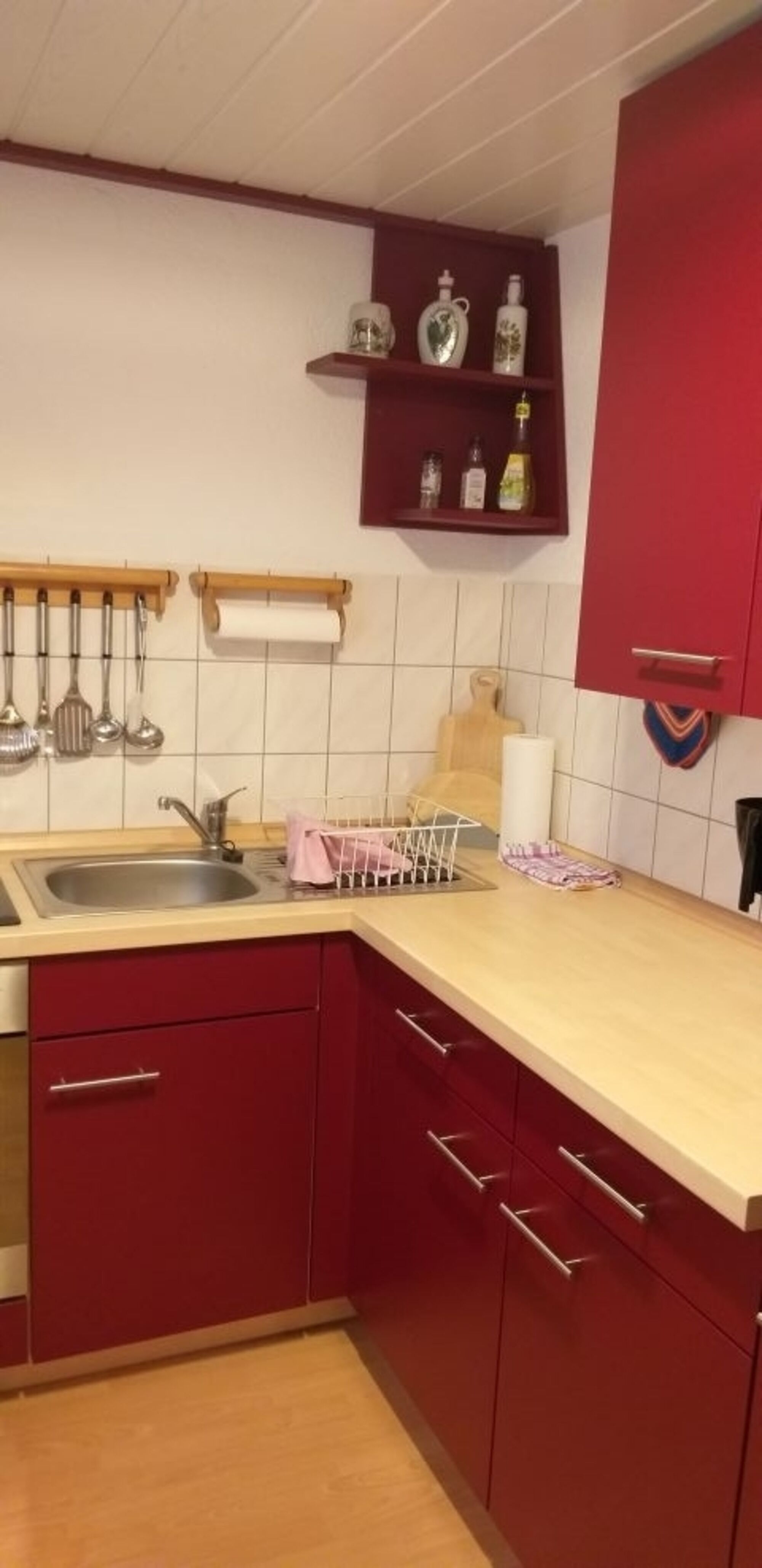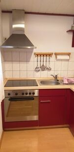 Cerankochfeld, Dunstabzugshaube, Kühlschrank mit Gefrierfach, Eierkocher, Korkenzieher / Flaschenöffner, Geschirrhandtücher, Mülltüten