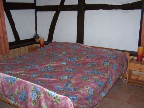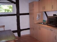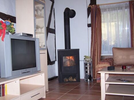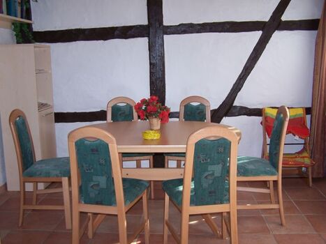 Ferienwohnung im Fachwerkstil mit komplett ausgestatteter Einbauküche (E-Herd mit Backofen, Dunstabzugshaube, Kühlschrank mit Gefrierfach, Mikrowelle, Kaffeemaschine, Wasserkocher, Toaster, Eierkocher, Geschirrspüler), großem Schlafzimmer mit Doppelbett und Zustellbett, Wohnzimmer mit Doppelbettcouch, SAT-TV, Kaminofen, LAN-Internetanschluß und Eßecke, Duschbad.
