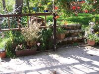 Das Gelände (Obstwiese) umfaßt ca. 1700 qm und ist komplett eingezäunt, sodaß Kinder gefahrlos spielen und toben können. Schaukel, Sandkasten sowie ein kleines Kletterhaus sind vorhanden.