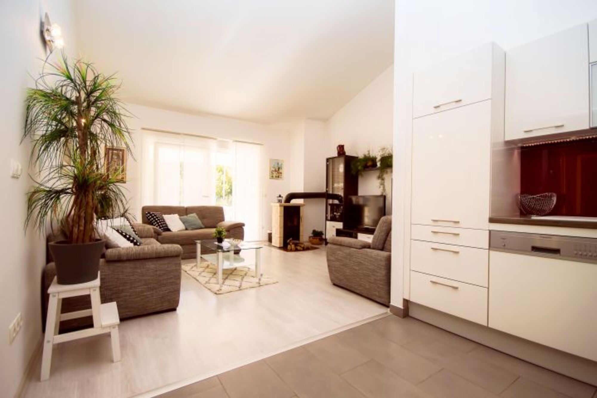 4-Platten Herd, Dunstabzugshaube, Kühlschrank mit Gefrierfach, Korkenzieher / Flaschenöffner, Geschirrhandtücher, Essplatz in der Küche