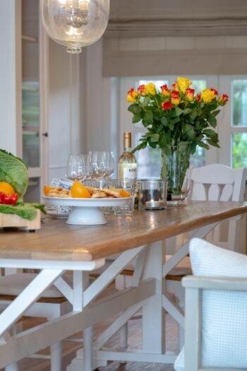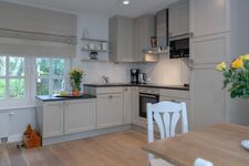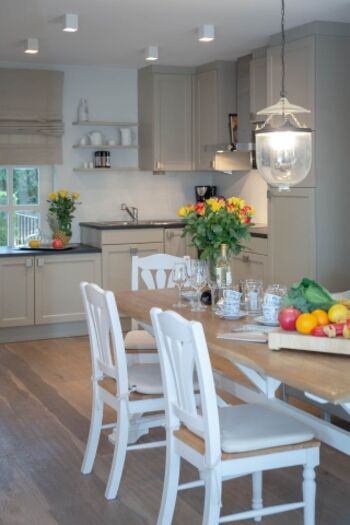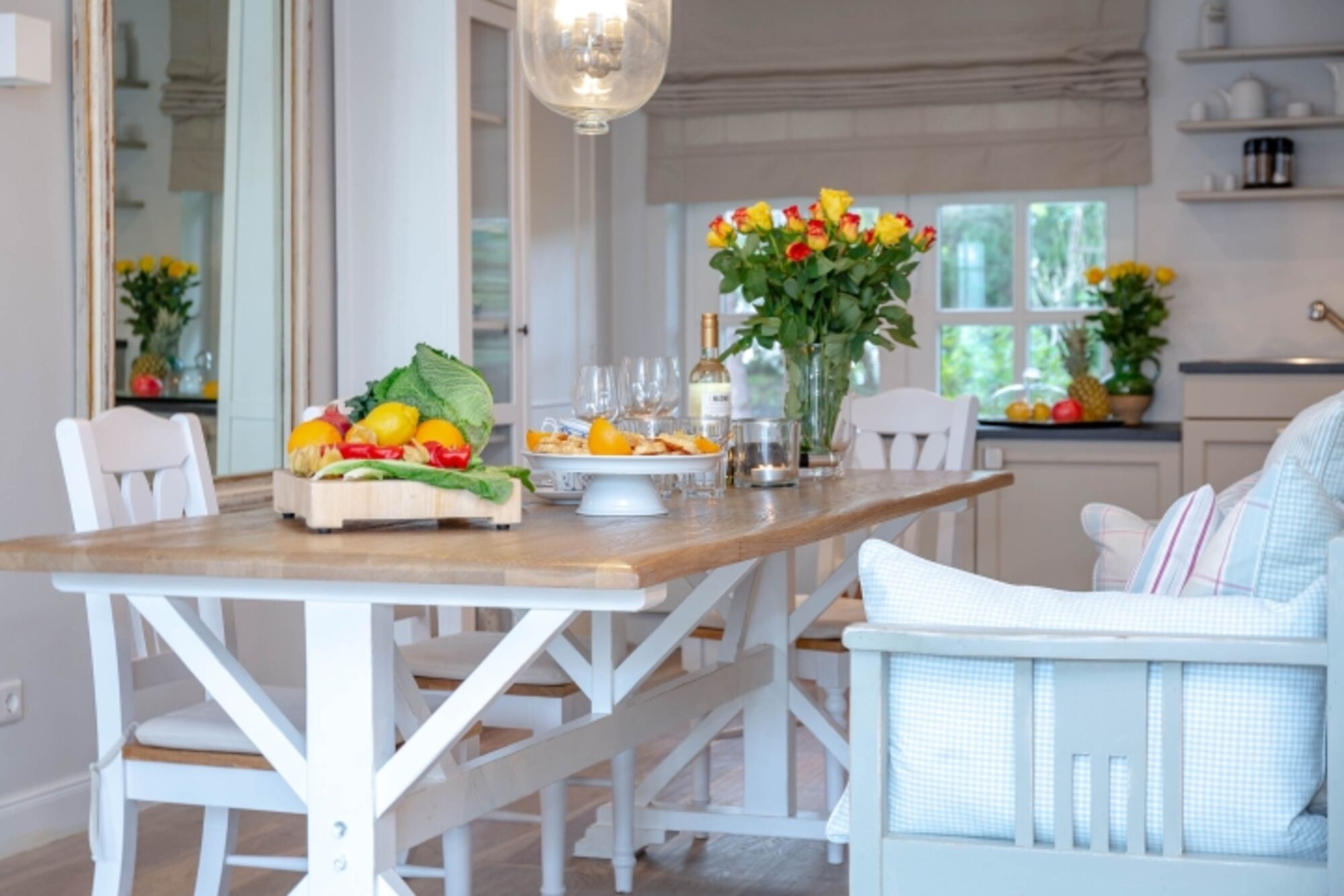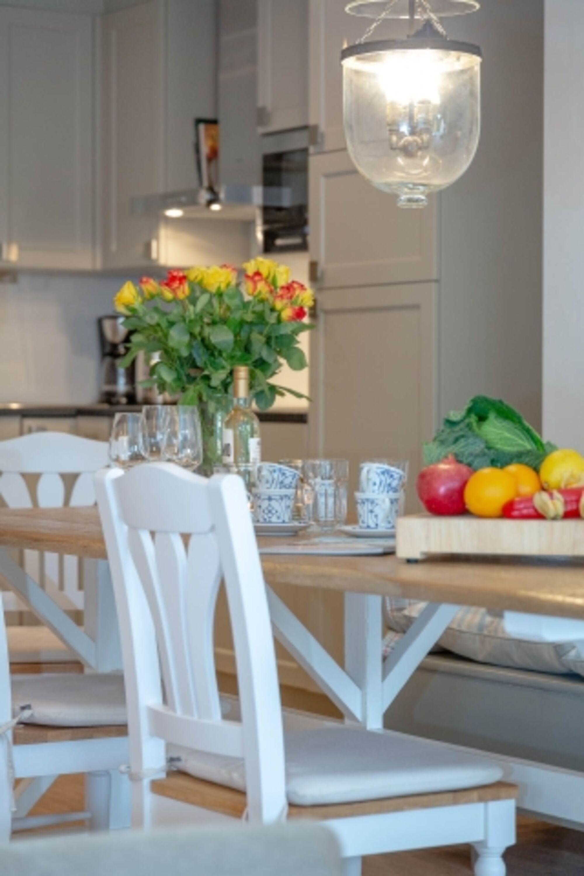 Der offene Essbereich lädt zum Verweilen ein, während die hochwertige und offene Küche die Selbstversorgung im Urlaub zum Kinderspiel werden lässt.