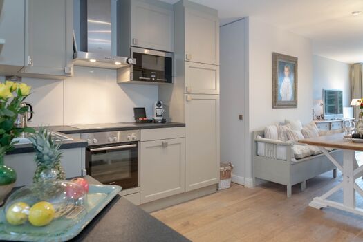 Cerankochfeld, Dunstabzugshaube, Kühlschrank mit Gefrierfach, Nespresso-Automat, Geschirrhandtücher, Mülltüten, Essplatz in der Küche