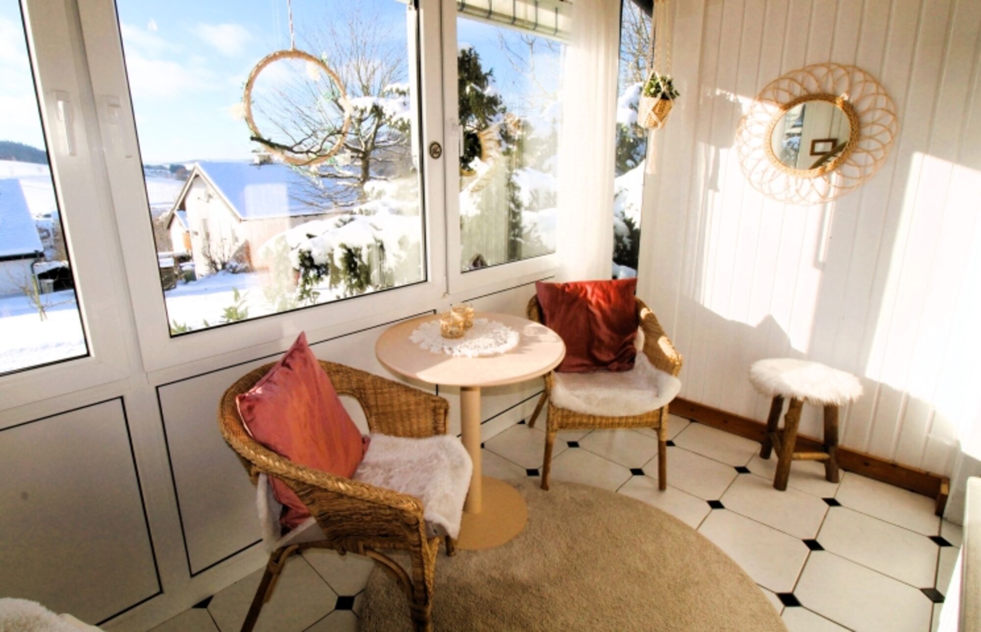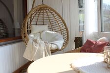 An gemütlichen Abenden im kleinen Wintergarten erleben Sie, wie die Sonne langsam hinter dem Ruthenberg versinkt und die Bruchhauser Steine in ein warmes, goldenes Licht taucht. Dieses Naturdenkmal, das majestätisch über der Landschaft thront, begleitet Sie mit immer neuen Stimmungen. Tagsüber sorgt eine Markise dafür, dass Ihr Platz an der Sonne angenehm schattig bleibt, sodass Sie zu jeder Tageszeit unbeschwerte Stunden im Wintergarten genießen können.