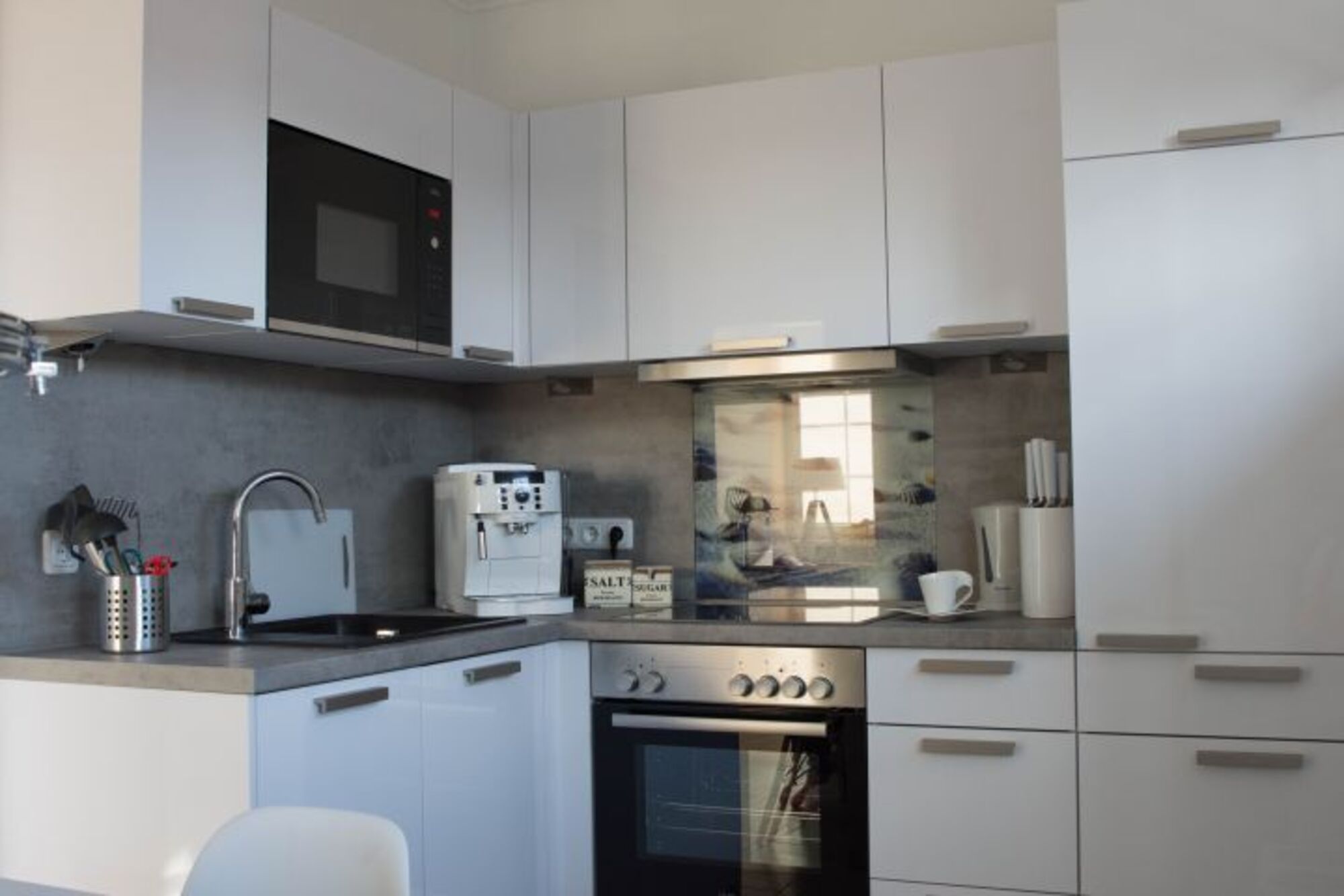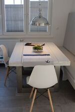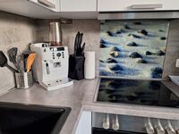Cerankochfeld, Dunstabzugshaube, Kühlschrank mit Gefrierfach, Kaffeevollautomat, Mixer, Waffeleisen, Korkenzieher / Flaschenöffner, Gewürze (Salz, Pfeffer, Zucker), Öl / Essig, Geschirrhandtücher, Mülltüten, Essplatz in der Küche