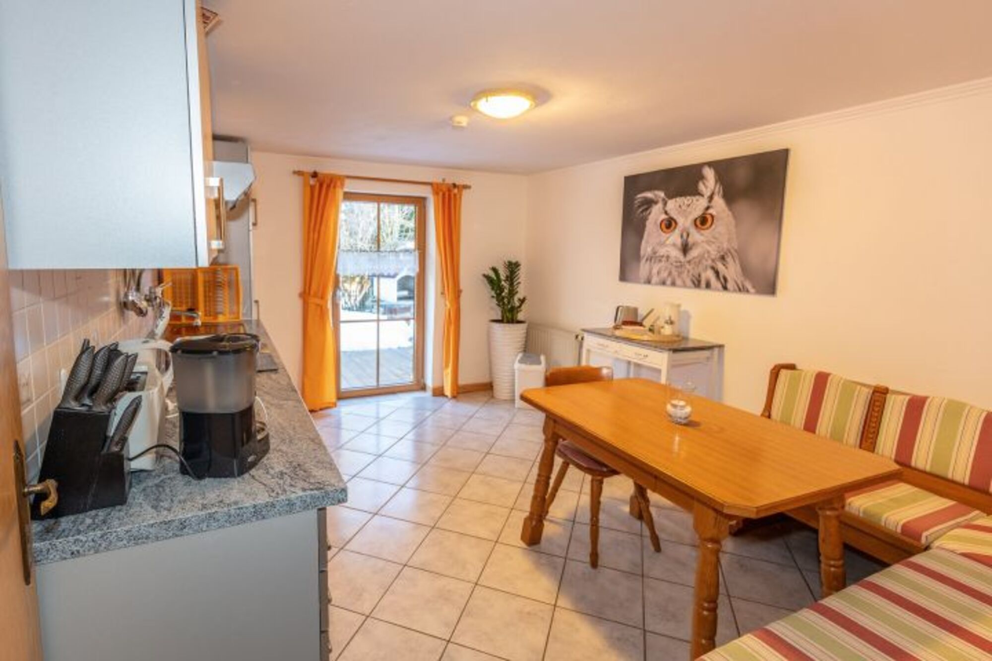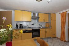Cerankochfeld, Dunstabzugshaube, Kühlschrank mit Gefrierfach, Mixer, Korkenzieher / Flaschenöffner, Gewürze (Salz, Pfeffer, Zucker), Geschirrhandtücher, Mülltüten, Essplatz in der Küche