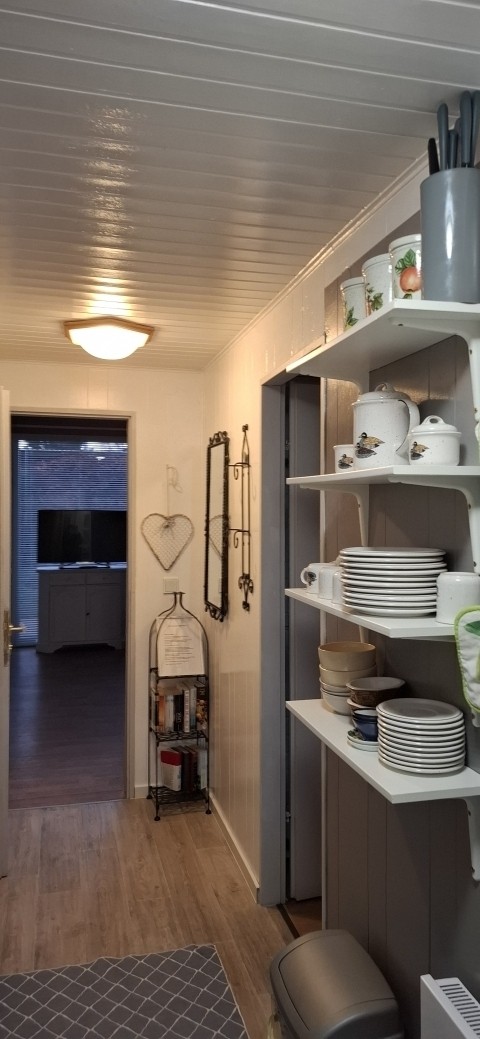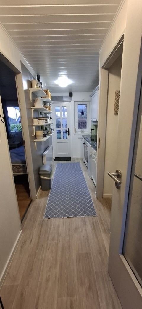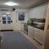 Die Küche befindet typischerweise bei diesen Nurdach-Ferienhäusern direkt am Hauseingang.
