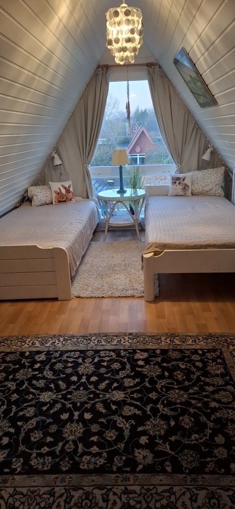 Dieses Schlafzimmer befindet sich unter dem Dach und auch hier können die Betten ( 2x 70cm breit) zusammen gestellt werden. Stauraum in der Abseite dient hier als Schrank , an der Wand befindet sich eine Befestigung für Kleiderbügel.