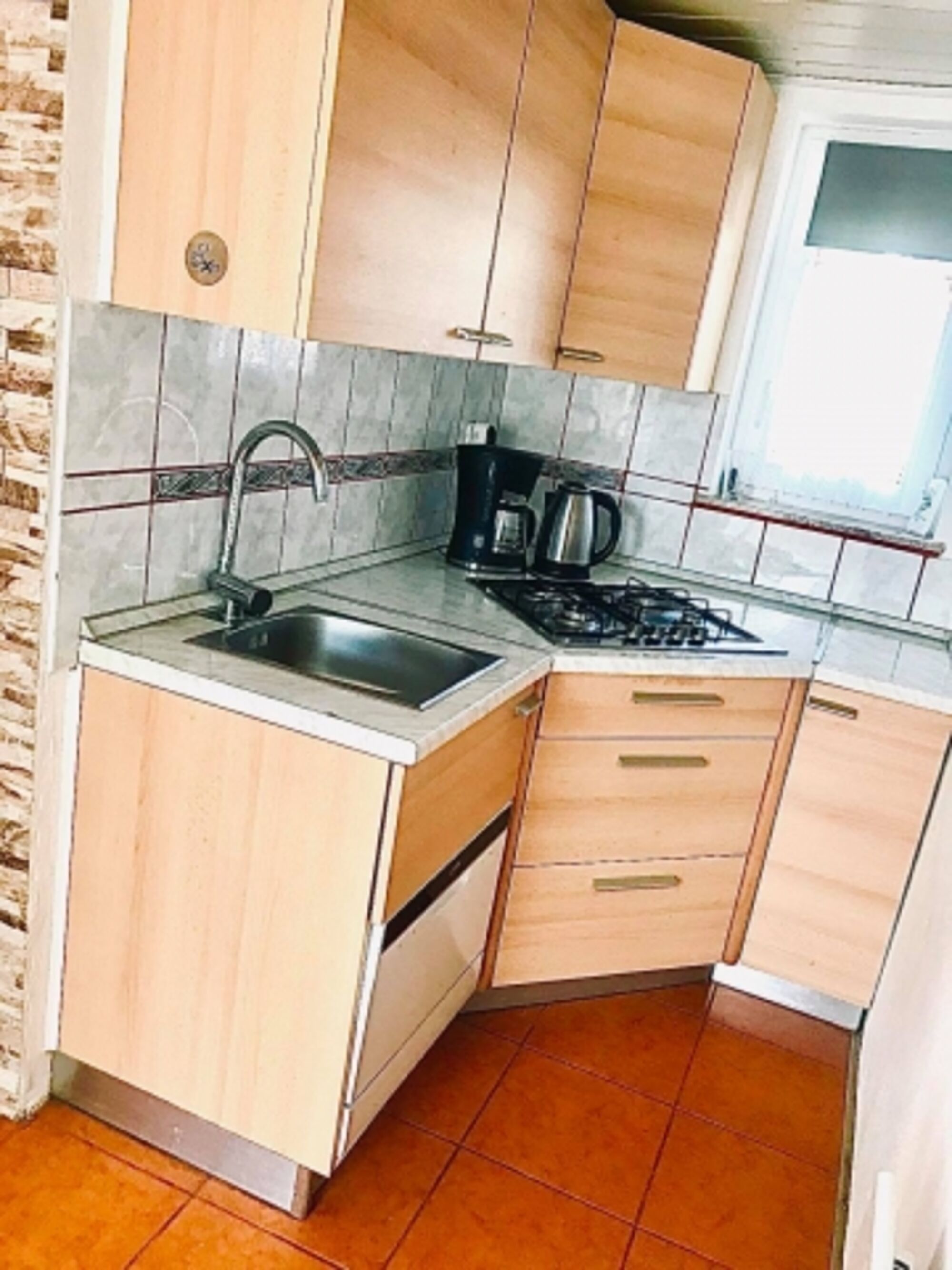 4-Platten Herd, Gasofen / Gasherd, Kühlschrank mit Gefrierfach, Gewürze (Salz, Pfeffer, Zucker), Geschirrhandtücher